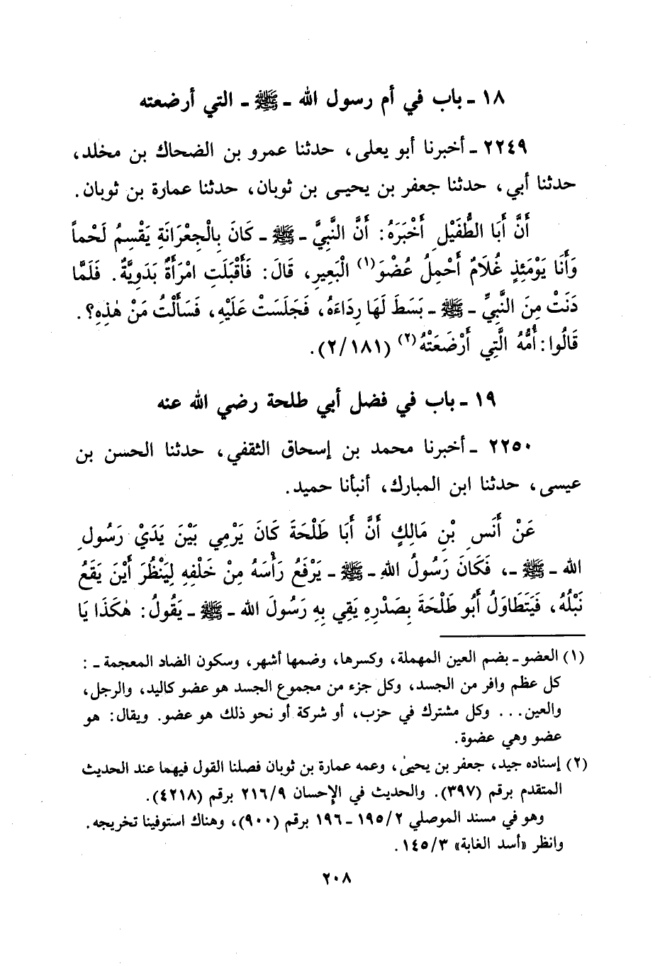 2250 - أخبرنا محمد بن إسحاق الثقفي، حدثنا الحسن بن عيسى، حدثنا ابن المبارك، أنبأنا حميد. عَنْ أنَسِ بْنِ مَالِكٍ أن أبَا طَلْحَةَ كَانَ يَرْمِي بَيْنَ يَدَي رَسُولِ الله -صلى الله عليه وسلم-، فكان رَسُولُ اللهِ -صلى الله عليه وسلم- يَرْفَعُ رَأْسَهُ مِنْ خَلْفِهِ لِيَنْظُرَ أيْنَ يَقَعُ نَبْلُهُ، فَيَتَطَاوَلُ أبُو طَلْحَةَ بِصَدْرِهِ يَقِي بِهِ رَسُول الله -صلى الله عليه وسلم- يقول: هكَذَا يَا