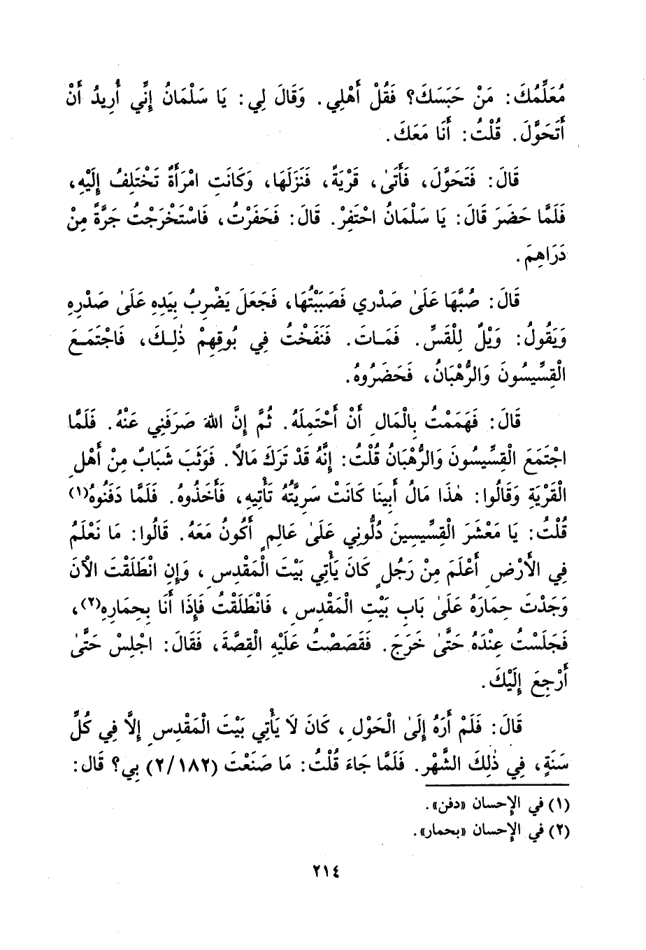 قَالَ: فَهَمَمْتُ بِالْمَالِ أنْ أحْتَمِلَهُ. ثُمَّ إنَّ اللهَ صَرَفَنِي عَنْهُ. فَلَمَّا اجْتَمَعَ الْقِسِّيسُونَ وَالرُّهْبَانُ قُلْتُ: إنَّهُ قَدْ تَرَكَ مَالاً. فَوَثَبَ شبابٌ مِنْ أَهْلِ الْقَرْيَةِ وَقَالُوا: هذَا مَالُ أبِينَا كَانَتْ سَرِيَّتُهُ تَأْتِيهِ، فَأخَذُوهُ. فَلَمَّا دَفَنُوهُ (¬1) قُلْتُ: يَا مَعْشَرَ الْقِسِّيسِينَ دُلّونِي عَلَى عَالِم أكُونُ مَعَهُ. قَالُوا: مَا نَعْلَمُ فِي الأرْضِ أعْلَمَ مِنْ رَجُلٍ كَانَ يَأتِي بَيْتَ الْمَقْدِسِ، وَإنِ انْطَلَقْتَ الْآنَ وَجَدْتَ حِمَارَهُ عَلَى بَابِ بَيْتِ الْمَقْدِسِ، فَانْطَلَقْتُ فَإذَا أَنَا بِحِمَارِهِ (¬2)، فجلست عِنْدَهُ حَتَّى خَرَجَ. فَقَصَصْتُ عَلَيْهِ الْقِصَّةَ، فَقَالَ: اجْلِسْ حتى أَرْجِعَ إلَيْكَ.