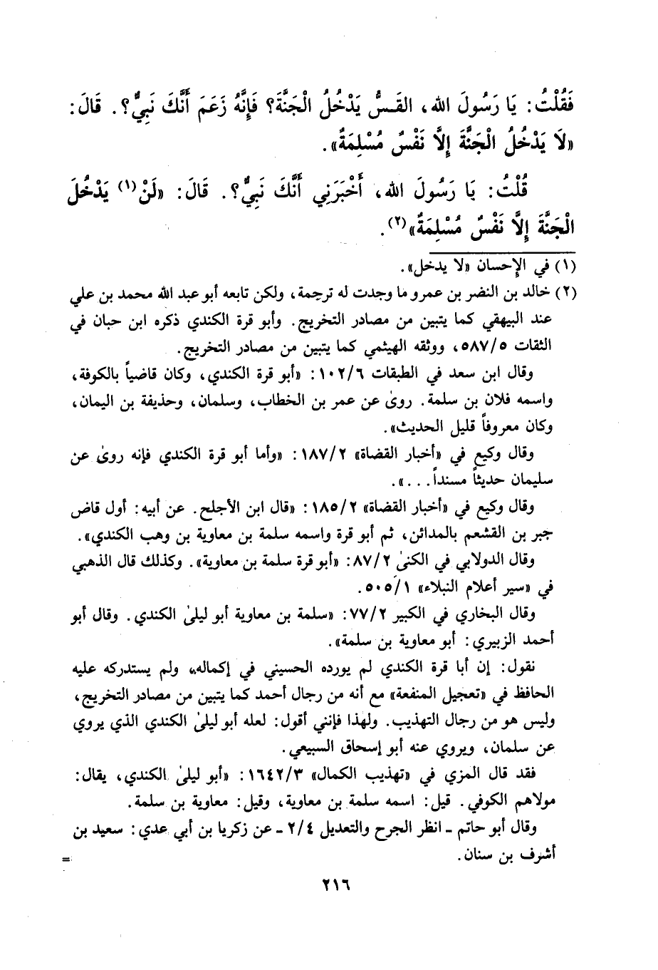 فَقلْتُ: يَا رَسُول الله، القَسُّ يَدْخُل الْجَنَّةَ؟ فَإِنَّهُ زَعَمَ أنَّكَ نَبِيٌّ؟. قَالَ: "لا يَدْخل الْجَنَّةَ إلا نفْسٌ مُسْلِمَةٌ".