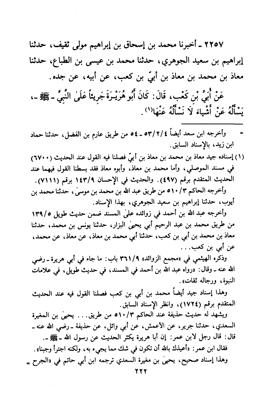 2257 - أخبرنا محمد بن إسحاق بن إبراهيم مولى ثقيف، حدثنا إبراهيم بن سعيد الجوهري، حدثنا محمد بن عيسى بن الطباع، حدثنا معاذ بن محمد بن معاذ بن أبيّ بن كعب، عن أبيه، عن جده.