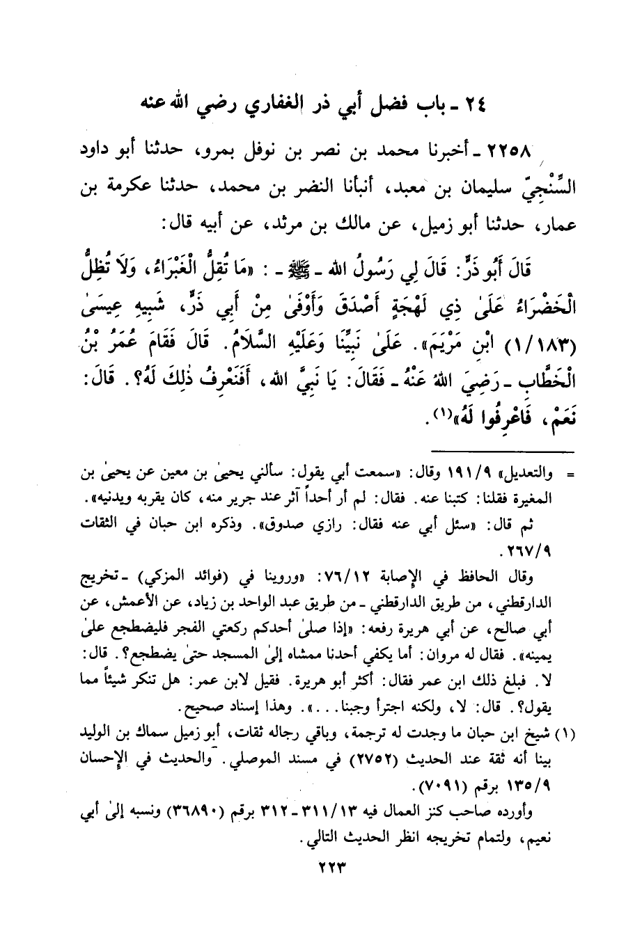 2258 - أخبرنا محمد بن نصر بن نوفل بمرو، حدثنا أبو داود السِّنْجِيّ سليمان بن معبد، أنبأنا النضر بن محمد، حدثنا عكرمة بن عمار، حدثنا أبو زميل، عن مالك بن مرثد، عن أبيه قال: