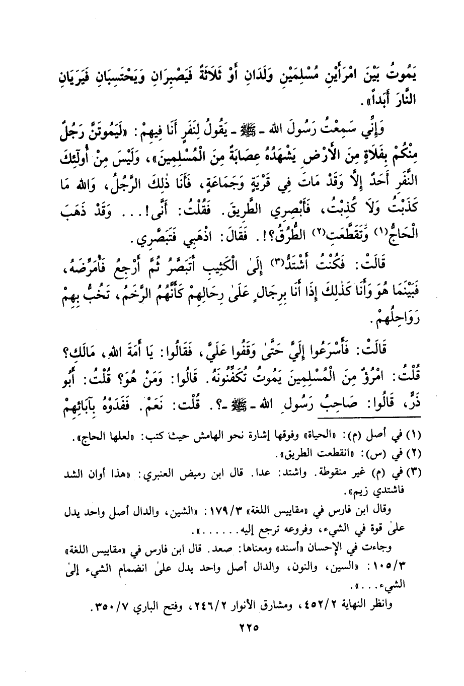 وَإِنِّي سَمِعْتُ رَسُول الله -صلى الله عليه وسلم- يَقُولُ لِنَفَرٍ أَنَا فِيهِمْ: "لَيَمُوتَنَّ رَجُل مِنْكمْ بفَلاَةٍ مِنَ الأرْضِ يَشْهَدُهُ عِصَابَةٌ مِنَ الْمُسْلِمِينَ"، وَلَيْسَ مِنْ أولئك النَّفَرِ أَحَدٌ إِلاَّ وَقَدْ مَاتَ فِي قَرْيَةٍ وَجَمَاعَةٍ، فَأَنَا ذلِكَ الرَّجُلُ، وَالله مَا كَذَبْتُ وَلاَ كُذبْتُ، فَأَبْصِرِي الطَّرِيقَ. فَقُلْتُ: أَنَّى! ... وَقَدْ ذَهَبَ الْحَاجُّ (¬1) وَتَقَطَّعَتِ (¬2) الطُّرُقُ؟!. فَقَالَ: اذْهَبِي فتبصَّرى.