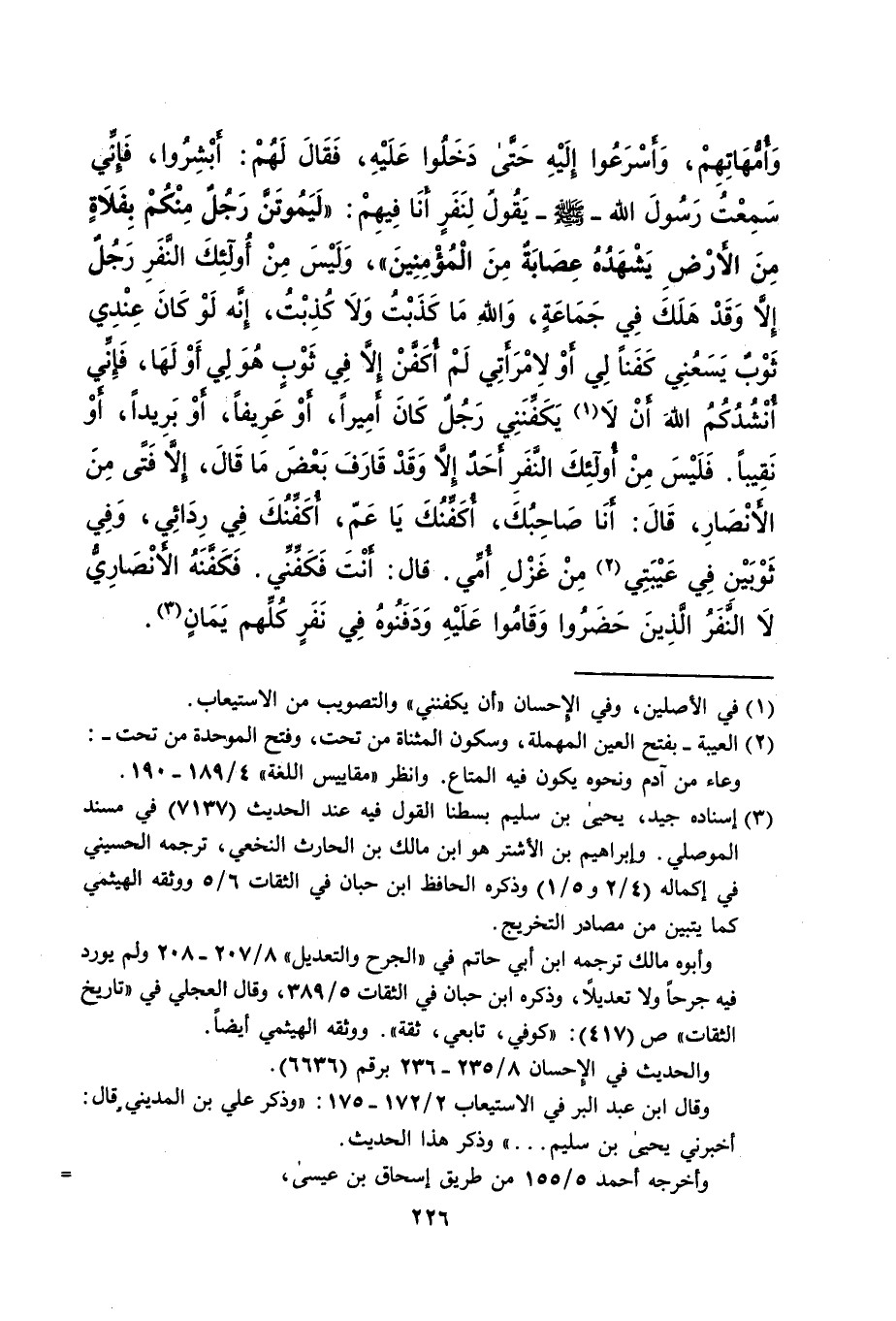 وَأُمُّهَاتِهِمْ، وَأَسْرَعُوا إلَيْهِ حَتَّى دَخَلُوا عَلَيْهِ، فَقَالَ لَهُمْ: أَبْشِرُوا، فَإنِّي سَمِعْتُ رَسُول الله -صلى الله عليه وسلم- يَقُولُ لِنَفَرٍ أنَا فِيهِمْ: "لَيَمُوتَنَّ رَجُلٌ مِنْكُمْ بِفَلاَةٍ مِنَ الأرْضِ يَشْهَدُهُ عِصَابَةٌ مِنَ الْمُؤْمِنِين"، وَلَيْسَ مِنْ أولئك النَّفَرِ رَجُل إلاَّ وَقَدْ هَلَكَ فِي جَمَاعةٍ، وَاللهِ مَا كَذَبْتُ وَلا كُذِبْتُ، إنَّه لَوْ كَانَ عِنْدِي ثَوْبٌ يَسَعُنِي كَفَناً لِي أوْ لاِمْرأَتِي لَمْ أُكَفَّنْ إلاَّ فِي ثَوْبٍ هُوَ لِي أَوْ لَهَا، فَإنِّي أُنْشُدُكُمُ اللهَ أنْ لا (¬1) يَكَفِّنَنِي رَجُلٌ كَانَ أمِيراً، أوْ عَرِيفاً، أوْ بَرِيداً، أوْ نَقِيباً. فَلَيْسَ مِنْ أولئك النَّفَرِ أَحَدٌ إلاَّ وَقَدْ قَارَفَ بَعْضَ مَا قَالَ، إلاَّ فَتًى مِنَ الأنْصَارِ، قَالَ: أنَا صَاحِبُكَ، أُكَفِّنُكَ يَا عَمّ، أُكَفِّنُكَ فِي رِدَائِي، وَفِي ثَوبيْن فِي عَيْبَتِي (¬2) مِنْ غَزْلِ أُمِّي. قال: أَنْتَ فَكَفِّنِّي. فَكَفَّنَهُ الأنْصَارِيُّ لا الَنَّفَرُ الَّذينَ حَضَرُوا وَقَامُوا عَلَيْهِ وَدَفَنُوة فِي نَفَرٍ كُلِّهم يَمَانٍ (¬3).