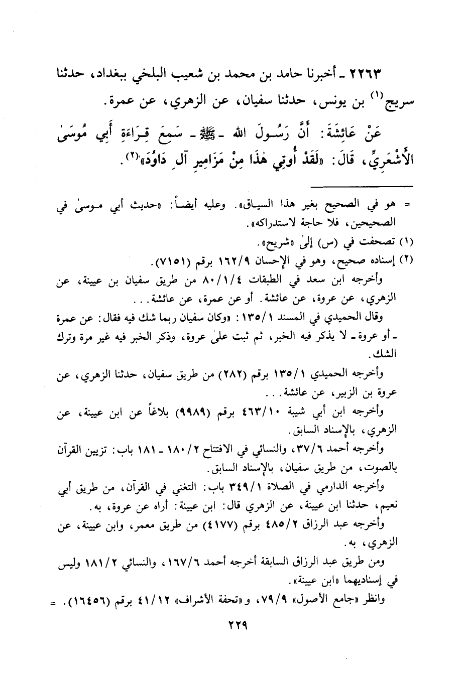 2263 - أخبرنا حامد بن محمد بن شعيب البلخي ببغداد، حدثنا سريج (¬1) بن يونس، حدثنا سفيان، عن الزهري، عن عمره.