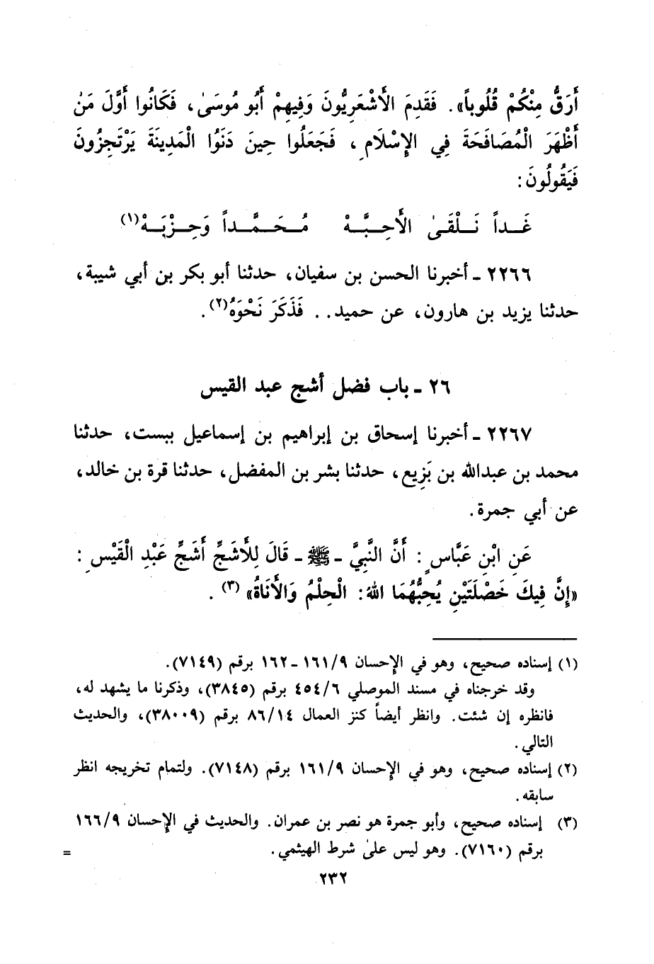أرَقُّ مِنْكُمْ قُلُوباً". فَقَدِمَ الأشْعَرِيُّونَ وَفِيهِمْ أَبُو مُوسَى، فَكَانُوا أَوَّلَ مَن أظهر الْمُصَافَحَةَ فِي الإسْلامِ، فَجَعَلُوا حِينَ دَنَوُا الْمَدِينَةَ يَرْتَجِزونَ