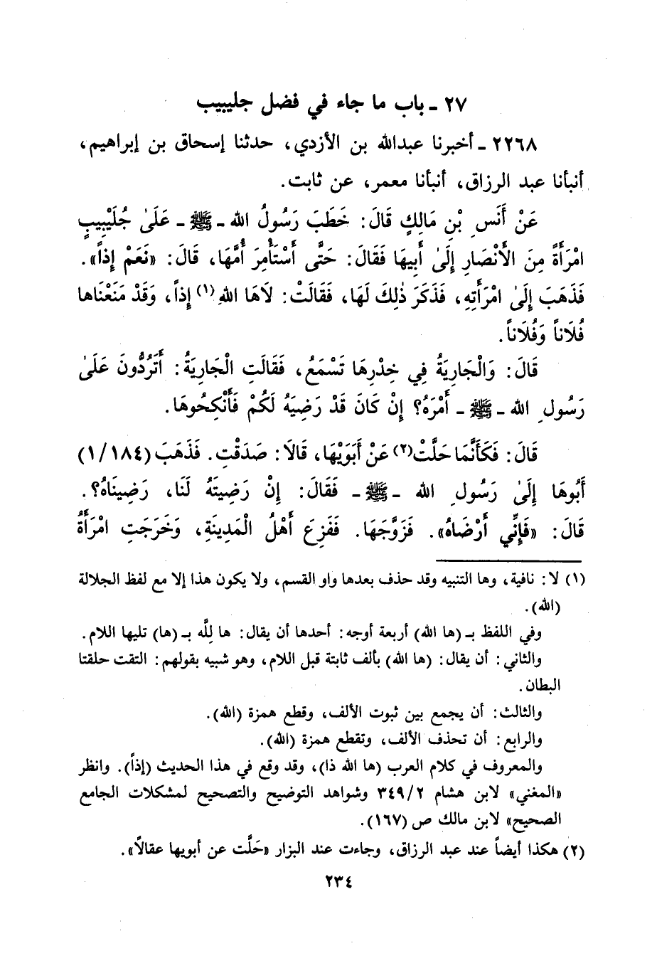 عَنْ أَنَسِ بْنِ مَالِكٍ قَالَ: خَطَب رَسُولُ الله -صلى الله عليه وسلم- عَلَى جُلَيْبِيبٍ امْرأةً مِنَ الأنْصَارِ إلَى أبِيهَا فَقَالَ: حَتَّى أَسْتَأْمِرَ أُمَّهَا، قَالَ: "نَعَمْ إذاً".
