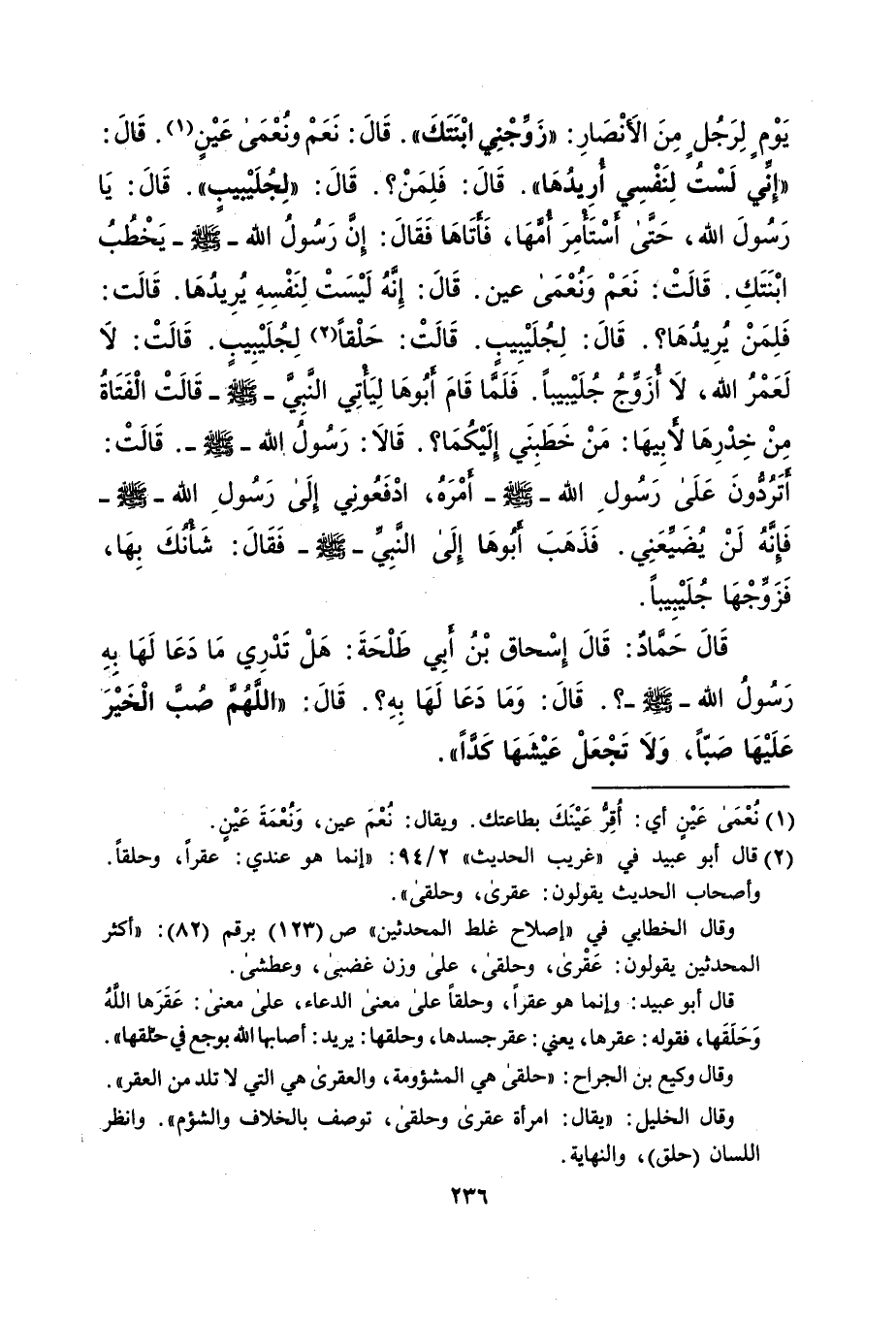 يَوْم لِرَجُلٍ مِنَ الأنْصَارِ: "زوِّجْنِى ابْنَتَكَ". قَالَ: نَعَمْ ونُعْمَى عَيْنٍ (¬1). قَالَ: "إنِّي لَسْتُ لِنَفْسِي أُرِيدُهَا". قَالَ: فَلِمَنْ؟. قَالَ: "لِجُلَيْبيبٍ". قَالَ: يَا رَسُولَ الله، حَتَّى أَسْتَأْمِرَ أُمَّهَا، فَأَتَاهَا فَقَالَ: إنَّ رَسُولُ الله -صلى الله عليه وسلم- يَخْطُبُ ابْنَتَكِ. قَالَت: نَعَمْ وَنُعْمَى عين. قَال: إِنَّهُ لَيْسَتْ لِنَفْسِهِ يُرِيدُهَا. قَالَت: فَلِمَنْ يُرِيدُهَا؟. قَالَ: لِجُلَيْبِيبٍ. قَالَت: "حَلْقاً (¬2) لِجُلَيْبِيبٍ. قَالَتْ: لاَ لَعَمْرُ الله، لا أُزَوِّجُ جُلَيْبيباً. فَلَمَّا قَامَ أبُوهَا لِيَأْتِي النَّبِيَّ -صلى الله عليه وسلم- قَالَتْ الْفَتَاةُ مِنْ خِدْرِهَا لأبِيهَا: مَنْ خَطَبِنَي إلَيْكُمَا؟. قَالا: رَسُولُ الله -صلى الله عليه وسلم-.قَالَتْ: أَتَرُدُّونَ عَلَى رَسُولِ الله -صلى الله عليه وسلم- أَمْرَهُ، ادْفَعُونِي إلَى رَسُولِ الله-صلى الله عليه وسلم - فَإنَّهُ لَنْ يُضَيِّعَنِي. فَذَهَبَ أَبُوهَا إِلَى النَّبى -صلى الله عليه وسلم- فَقَالَ: شَأْنُكَ بِهَا، فَزَوّجْهَا جُلَيْبِيباً.