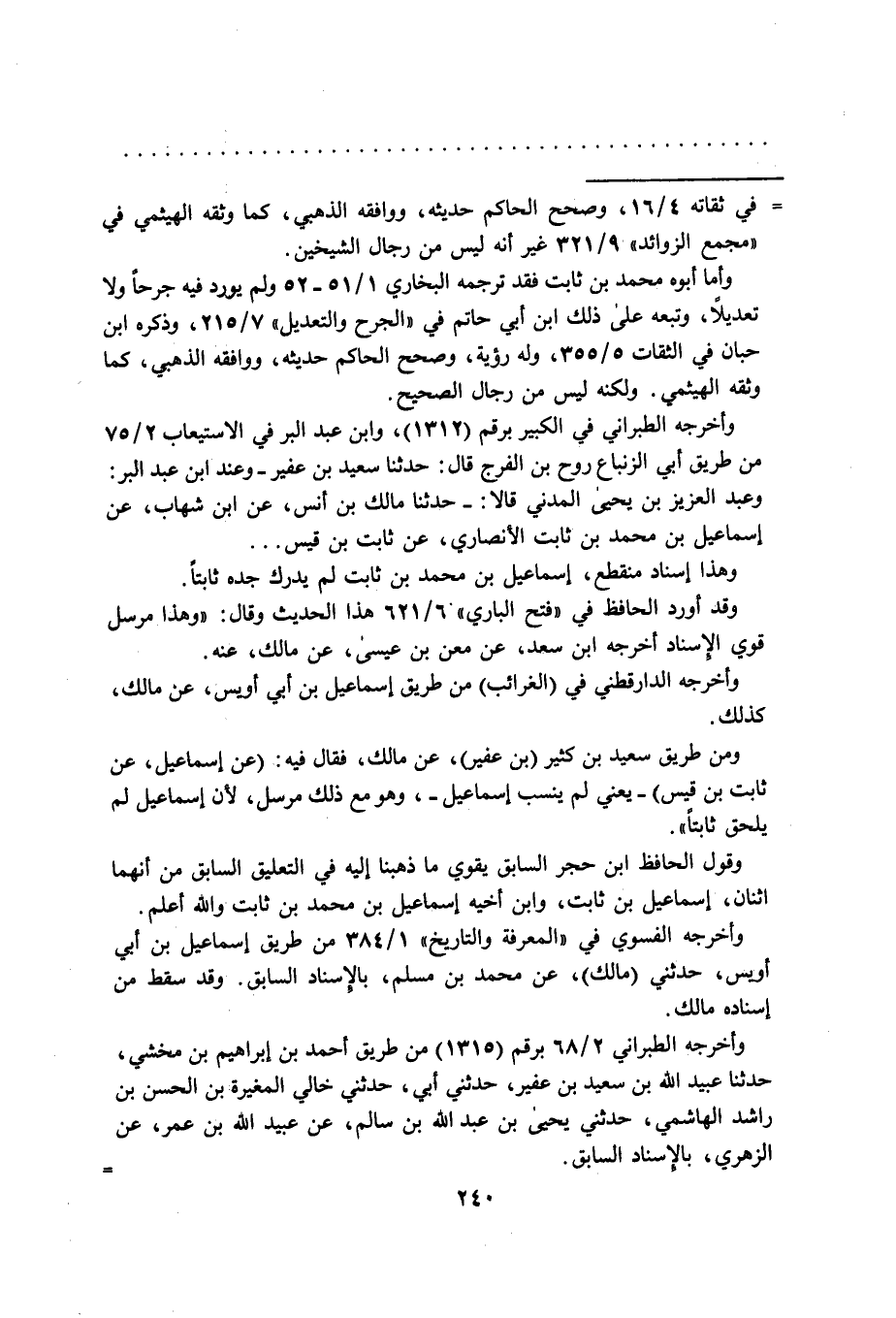 وأما أبوه محمد بن ثابت فقد ترجمه البخاري 1/ 51 - 52 ولم يورد فيه جرحاً ولا تعديلاً، وتبعه على ذلك ابن أبي حاتم في "الجرح والتعديل" 7/ 215، وذكره ابن حبان في الثقات 5/ 355، وله رؤية، وصحح الحاكم حديثه، ووافقه الذهبي، كما وثقه الهيثمي. ولكنه ليس من رجال الصحيح.