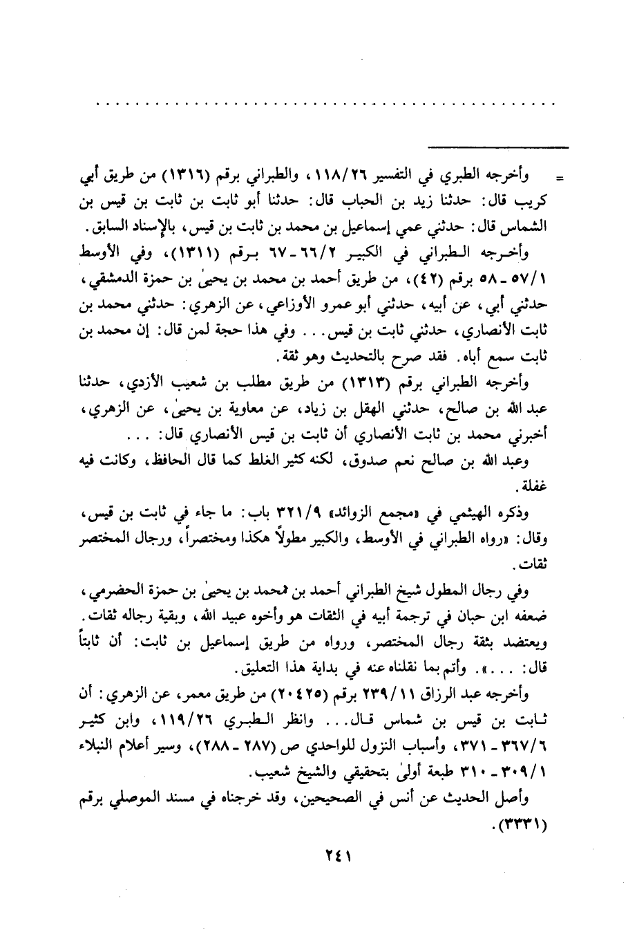 = وأخرجه الطبري في التفسير 26/ 118، والطبراني برقم (1316) من طريق أبي كريب قال: حدثنا زيد بن الحباب قال: حدثنا أبو ثابت بن ثابت بن قيس بن الشماس قال: حدثني عمي إسماعيل بن محمد بن ثابت بن قيس، بالأسناد السابق.
