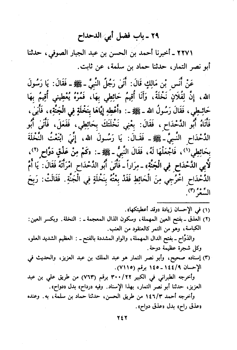 عَنْ أنَسِ بْن مَالِكٍ قَالَ: أتَى رَجُلٌ النَّبِيَّ -صلى الله عليه وسلم-فَقَالَ: يَا رَسُولَ الله، إِنَّ لِفلانٍ نَخْلَة، وَأَنَا أُقِيمُ حَائِطِي بِهَا، فَمُرْهُ يُعْطِينِي أُقِيمُ بِهَا حَائِطِي، فَقَالَ رَسُول الله -صلى الله عليه وسلم-: "أعْطِهِ إيَّاهَا بِنَخْلَةٍ فِي الْجَنّةِ"، فَأبَى، فَاتَاهُ أبو الدَّحْدَاحِ، فَقَالَ: بِعْنِي نَخْلَتَكَ بِحَائِطِي، فَفَعَلَ، فَأتَى أَبُو الدَّحْدَاحِ النَّبِيَّ -صلى الله عليه وسلم- فَقَالَ: يَا رَسُول الله، إنِّيَ ابْتَعْتُ النَّخْلَةَ بحَائِطِي (¬1)، فَاجْعَلْهَا لَهُ، فَقَالَ النَّبِيُّ -صلى الله عليه وسلم-: "كَمْ مِنْ عَذْقٍ دَوَّاحٍ (¬2)، لأبِي الدَّحْدَاحِ فِي الْجَنَّةِ"- مِرَاراً- فَأتَى أبو الدَّحْدَاح امْرأتَهُ فَقَالَ: يَا أُمَّ الدَّحْدَاحِ اخْرُجِي مِنَ الْحَائِطِ فَقَدْ بعْتُة بنَخْلَةٍ فِي الْجَنَّةِ. فَقَالَتْ: رَبِحَ السِّعْرُ (¬3).َ