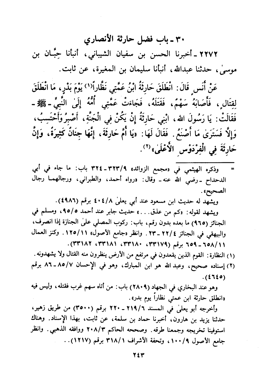 عَنْ أنَس قَالَ: انْطَلَقَ حَارِثَةُ ابْنُ عَمَّتِى نَظَّاراً (¬1) يَوْمَ بَدْرٍ، مَا انْطَلَقَ لِقِتَالٍ، فَأصَابَهُ سَهْمٌ، فَقَتَلَهُ، فَجَاءَتْ. عَمَّتِي أُمُّهُ إِلَى النَّبِيِّ -صلى الله عليه وسلم- فَقَالَتْ: يَا رَسُول الله، ابْنِي حَارِثَةُ إنْ يَكُنْ فِي الْجَنةِ، أَصْبِرُ وَأَحْتَسِبُ، وَإِلا فَسَتَرَى مَا أصْنَعُ. فَقَالَ لَهَا: "يَا أمَّ حَارِثَةَ، إِنَّهَا جِنَانٌ كَثِيرَةٌ، وَإنَّ حَارِثَةَ فِي الْفِرْدَوْسَ الأعْلَى" (¬2).