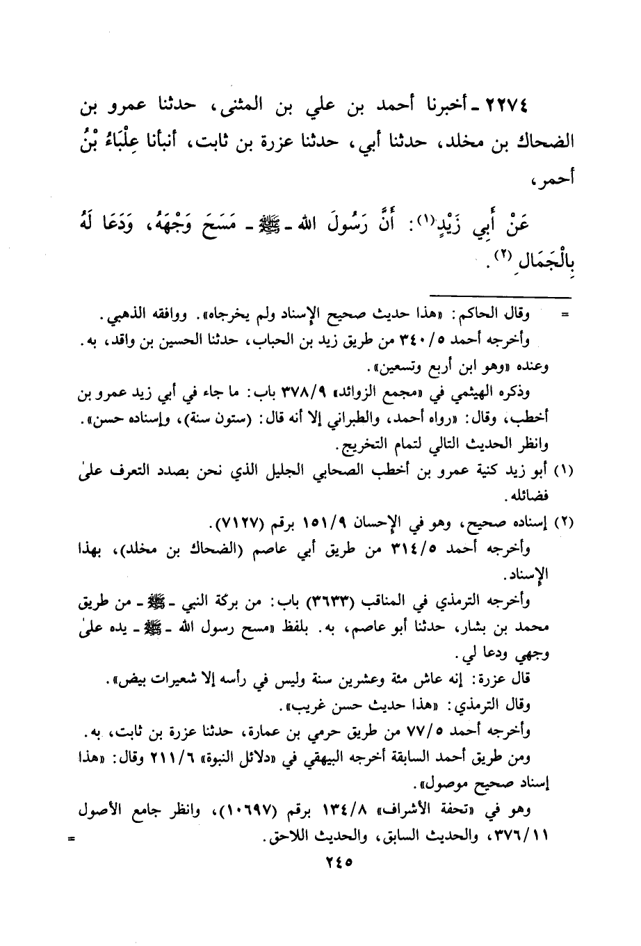 2274 - أخبرنا أحمد بن علي بن المثنى، حدثنا عمرو بن الضحاك بن مخلد، حدثنا أبي، حدثنا عزرة بن ثابت، أنبأنا عِلْبَاءُ بْنُ أحمر، عَنْ أبِي زَيْدٍ (¬1):أنَّ رَسُول الله -صلى الله عليه وسلم- مَسَحَ وَجْهَهُ، وَدَعَا لَهُ بِالْجَمَالَ (¬2)