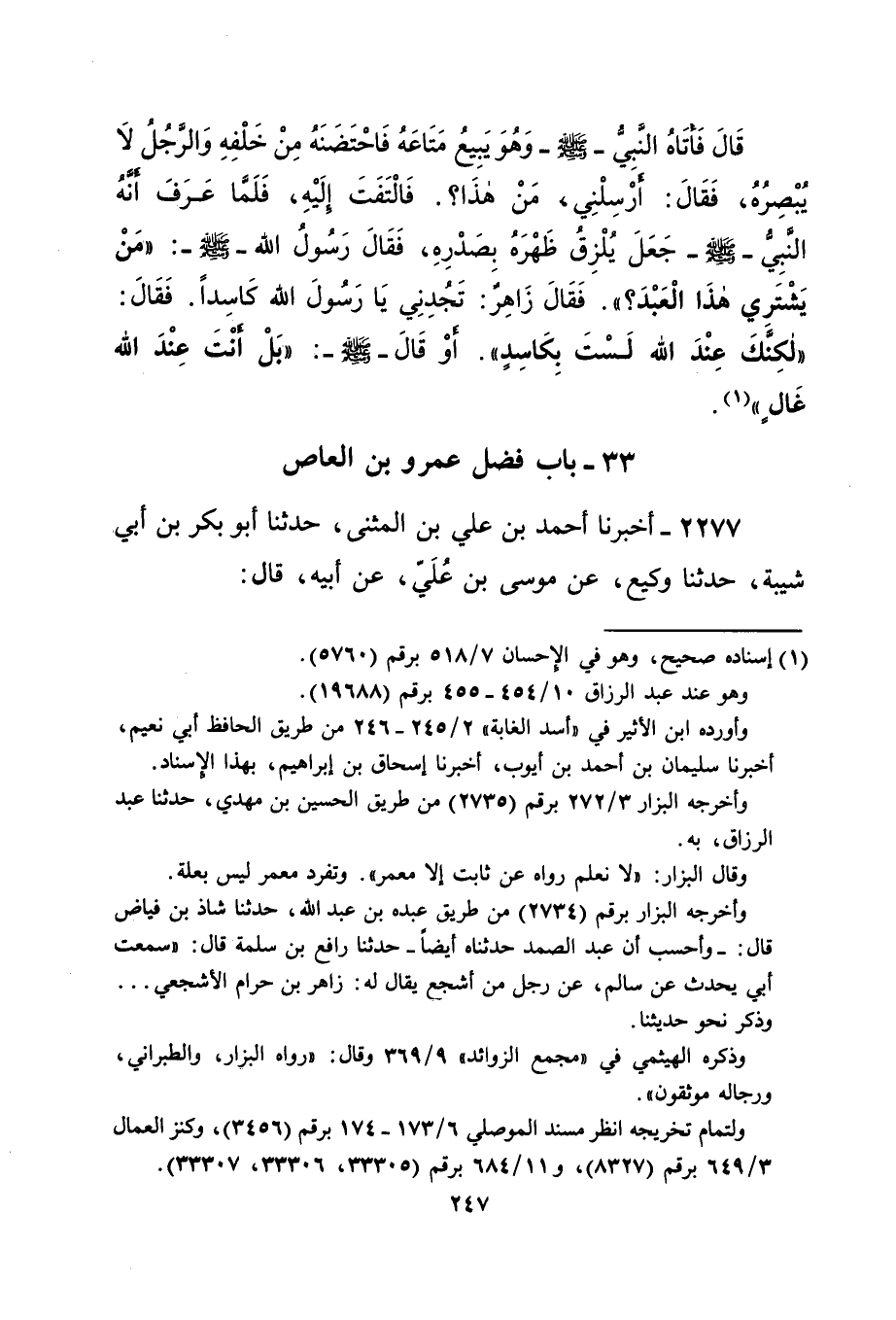 قَالَ فَأتَاهُ النَّبِيُّ -صلى الله عليه وسلم- وَهُوَ يَبِيعُ مَتَاعَهُ فَاحْتَضَنَهُ مِنْ خَلْفِهِ وَالرَّجُلُ لا يُبْصِرُهُ، فَقَالَ: أَرْسِلْنِي، مَنْ هذَا؟. فَالْتَفَتَ إلَيْهِ، فَلَمَّا عَرَفَ أنَّهُ النَّبِيُّ-صلى الله عليه وسلم-جَعَلَ يُلْزِقُ ظَهْرَهُ بِصَدْرِهِ، فَقَالَ رَسُولُ الله-صلى الله عليه وسلم -: "مَنْ يَشْتَري هذَا الْعَبْدَ؟ لا. فَقَالَ زَاهِرٌ: تَجُدِنِي يَا رَسُول الله كَاسِداً. فَقَالَ: "لكِنَّكَ عِنْدَ الله لَسْتَ بِكَاسِدٍ". أوْ قَالَ -صلى الله عليه وسلم-: "بَلْ أنْتَ عِنْدَ الله غَالٍ" (¬1).