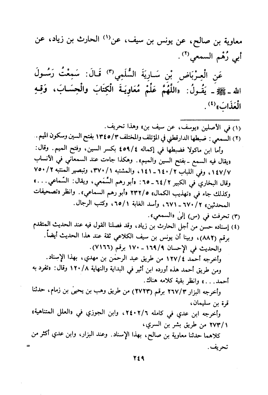 عَنِ العرباض بْنِ سَارِيَةَ السُّلَمِي (¬3) قَالَ: سَمِعْتُ رَسُولَ الله -صلى الله عليه وسلم- يَقُولُ: "اللَّهُمَّ عَلِّمْ مُعَاوِيَةَ الْكِتَابَ والْحِسَابَ، وَقِهِ الْعَذَابَ" (¬4).