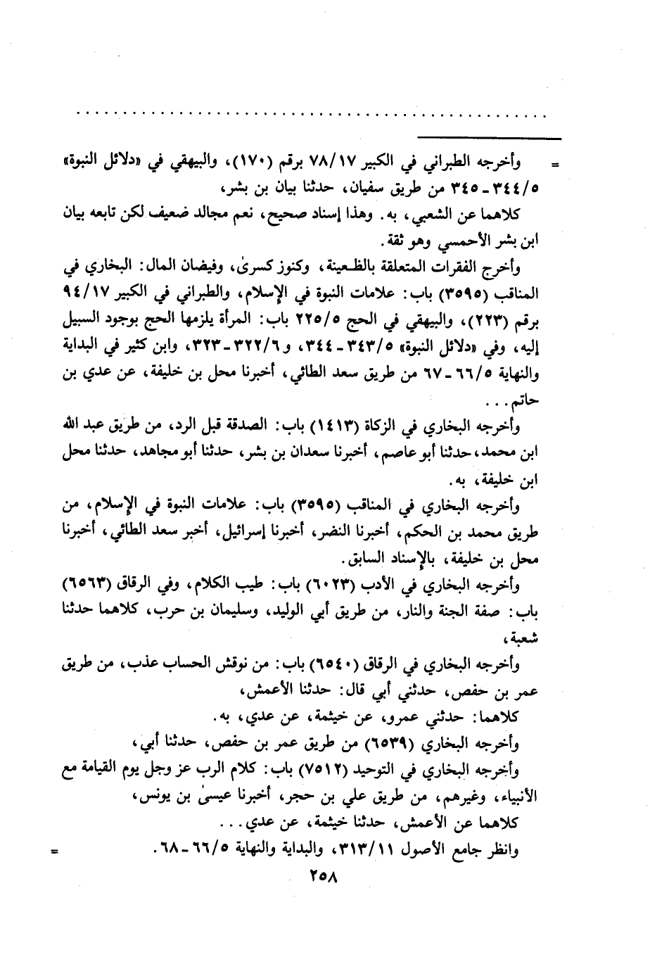 وأخرج الفقرات المتعلقة بالظعينة، وكنوز كسرى، وفيضان المال: البخاري في المناقب (3595) باب: علامات النبوة في الإسلام، والطبراني في الكبير 17/ 94 برقم (223)، والبيهقي في الحج 5/ 225 باب: المرأة يلزمها الحج بوجود السبيل إليه، وفي "دلائل النبوة" 5/ 343 - 344، و 6/ 322 - 323، وابن كثير في البداية والنهاية 5/ 66 - 67 من طريق سعد الطائي، أخبرنا محل بن خليفة، عن عدي بن حاتم ...