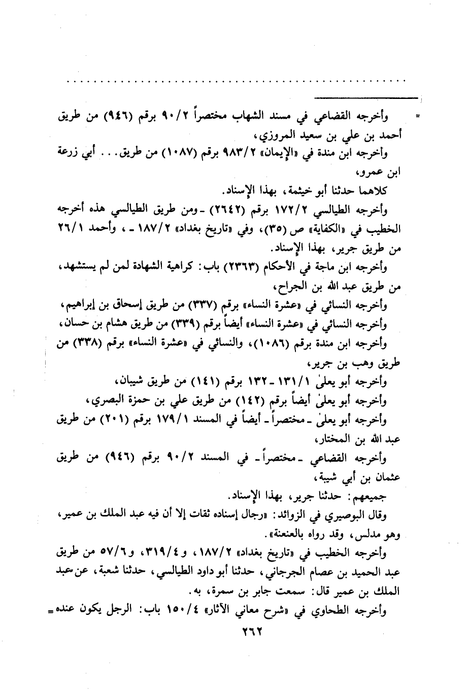 وأخرجه ابن ماجه في الأحكام (2363) باب: كراهية الشهادة لمن لم يستشهد، من طريق عبد الله بن الجراح، وأخرجه النسائي في "عشرة النساء" برقم (337) من طريق إسحاق بن إيراهيم، وأخرجه النسائي في "عشرة النساء" أيضاً برقم (339) من طريق هشام بن حسان، وأخرجه ابن منده برقم (1086)، والنسائي في "عشرة النساء" برقم (338) من طريق وهب بن جرير، وأخرجه أبو يعلى 1/ 131 - 132 برقم (141) من طريق شيبان، وأخرجه أبو يعلى أيضاً برقم (142) من طريق علي بن حمزة البصري، وأخرجه أبو يعلى -مختصراً- أيضاً في المسند 1/ 179 برقم (201) من طريق عبد الله بن المختار، وأخرجه القضاعي -مختصراً- في المسند 2/ 90 برقم (946) من طريق عثمان بن أبي شيبة، جميعهم: حدثنا جرير، بهذا الإسناد.