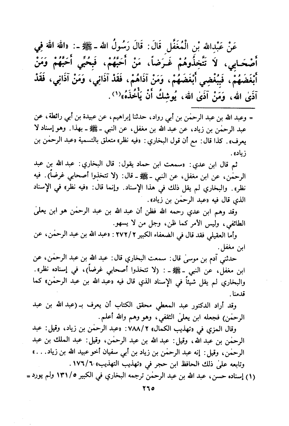 ثم قال ابن عدي: "سمعت ابن حماد يقول: قال البخاري: عبد الله بن عبد الرحمن، عن ابن مغفل، عن النبي- صلى الله عليه وسلم-قال: (لا تتخذوا أصحابي غرضاً). فيه نظر". والبخاري لم يقل ذلك في هذا الإسناد. وإنما قال: "فيه نظر" في الإسناد الذي قال فيه "عبد الرحمن بن زياد".