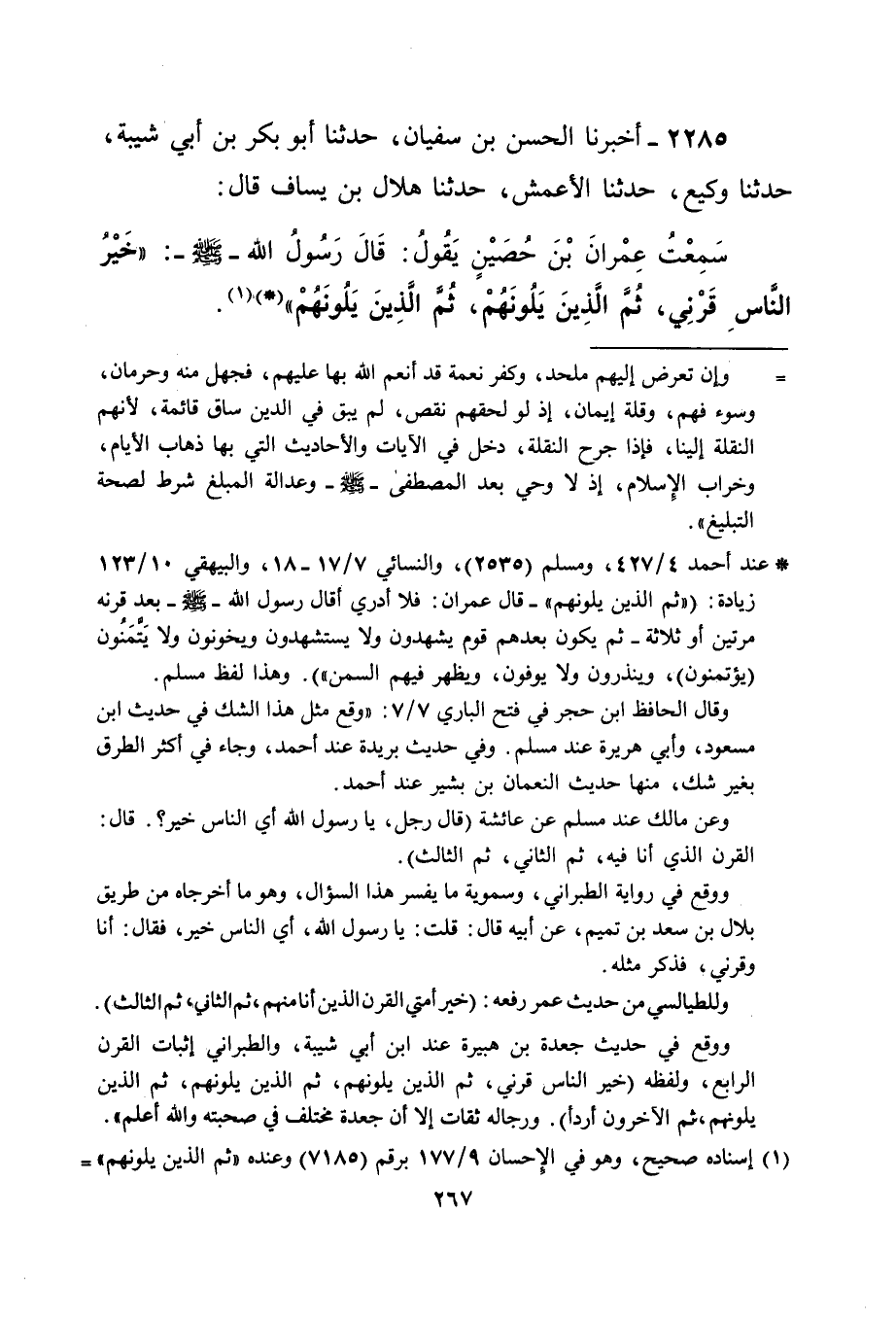 سَمِعْتُ عِمْرانَ بْنَ حُصَيْنٍ يَقُولُ: قَالَ رَسُولُ الله -صلى الله عليه وسلم-:"خَيْرُ النَّاسِ قَرْنِي، ثُمّ الّذِينَ يَلُونَهُمْ، ثُمَّ الّذِينَ يَلُونَهُمْ" (*) (¬1).