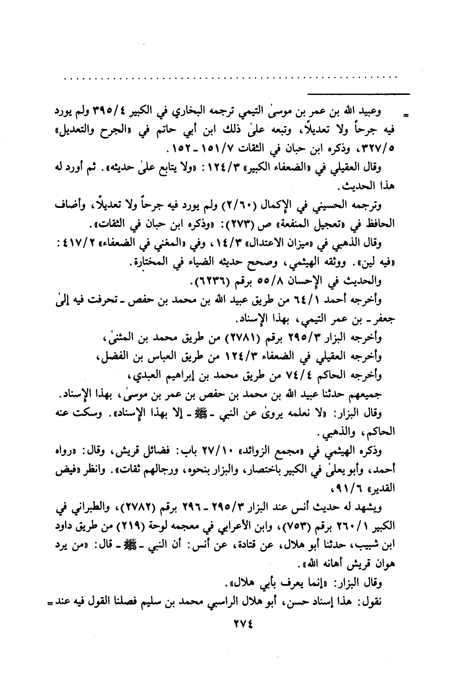 = وعبيد الله بن عمر بن موسى التيمي ترجمه البخاري في الكبير 4/ 395 ولم يورد فيه جرحاً ولا تعديلاً، وتبعه على ذلك ابن أبي حاتم في "الجرح والتعديل" 5/ 327، وذكره ابن حبان في الثقات 7/ 151 - 152.