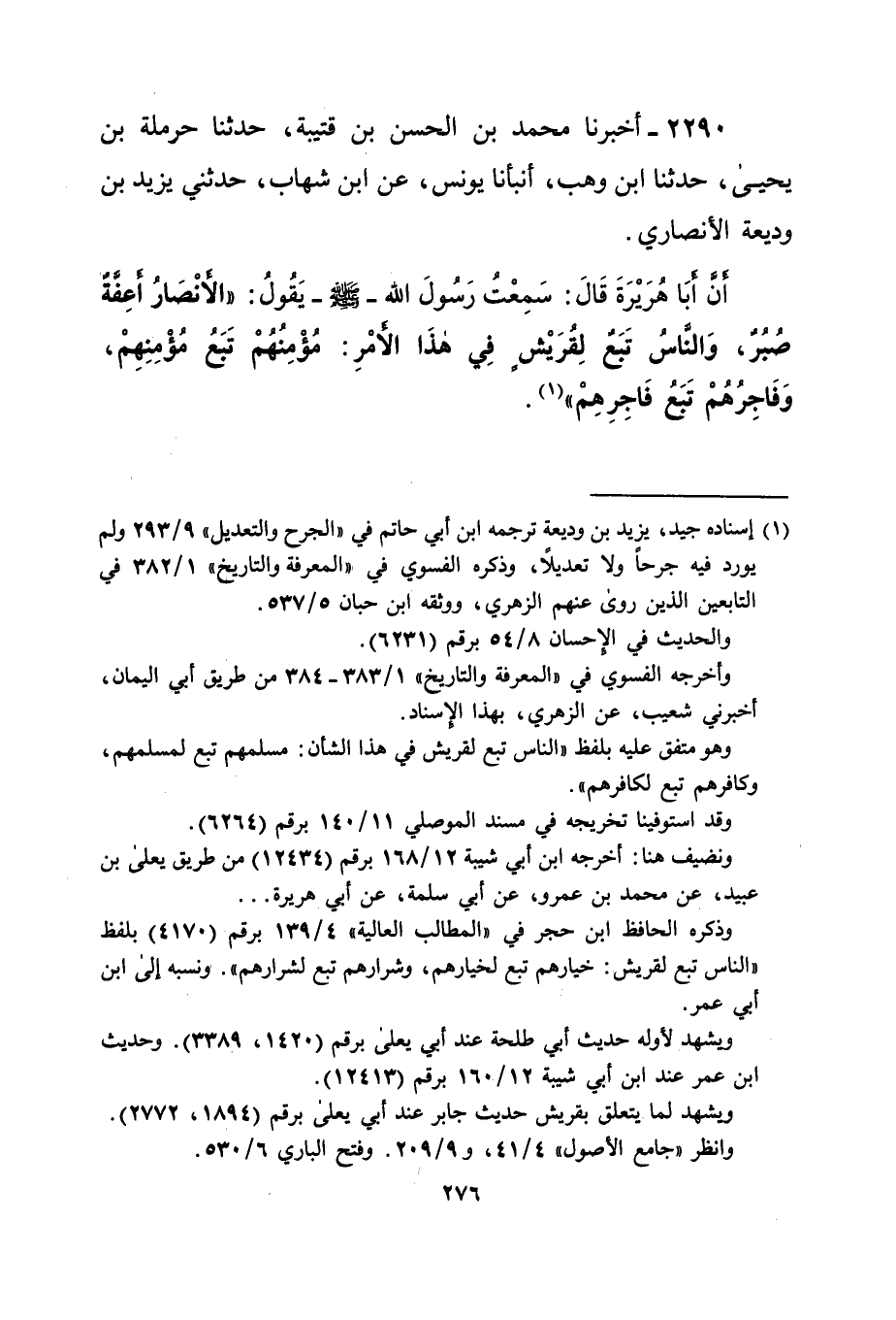 أنَّ أبَا هُوَيْرَةَ قَالَ: سَمِعْتُ رَسُول الله -صلى الله عليه وسلم- يَقول: "الأنْصَارُ أعِفَّةٌ صُبُرٌ، وَالنَّاسُ تبعٌ لِقُرَيْش فِى هذَا الأمْرِ: مؤمِنُهُمْ تَبَعُ مُؤْمِنِهمْ، وَفَاجِرُهُمْ تَبَعُ فَاجِرِهِمْ" (¬1).