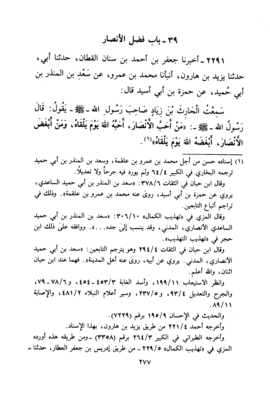 سَمِعْتُ الْحَارِثَ بْنَ زِيَادٍ صَاحِبَ رَسُولِ الله -صلى الله عليه وسلم- يَقُولُ: قَالَ رَسُولُ الله -صلى الله عليه وسلم-: "مَنْ أحَبَّ الأنْصَارَ، أحَبَّهُ اللهُ يَوْمَ يَلْقَاهُ، وَمَنْ أبْغَضَ الأنْصَارَ، أبْغَضَهُ الله يَوْمَ يَلْقَاهُ" (¬1).