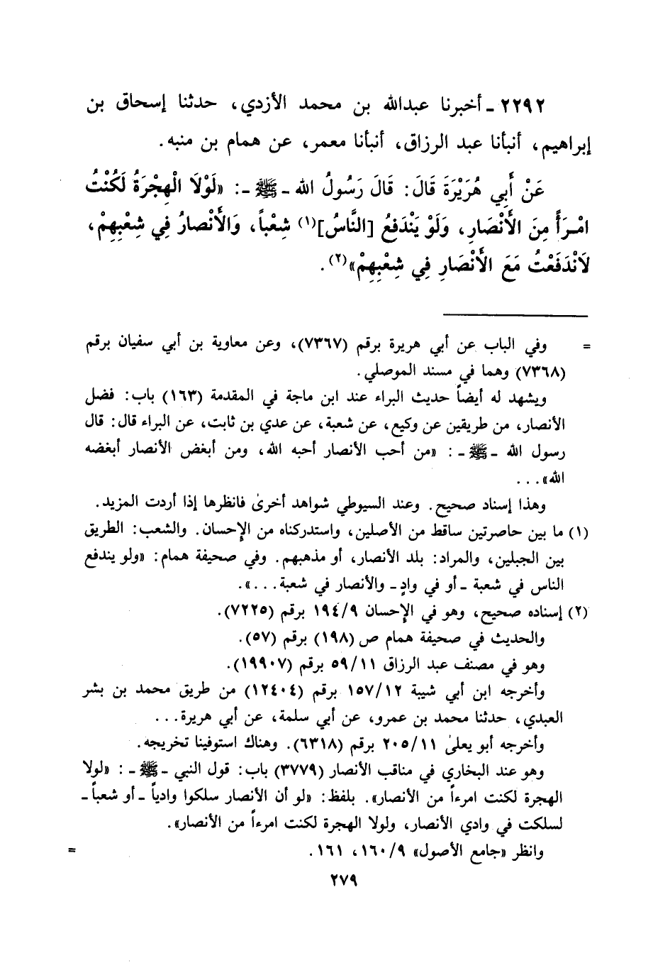 عَنْ أبِي هُرَيْرَةَ قَالَ: قَالَ رَسُولُ الله -صلى الله عليه وسلم-: "لَوْلا الْهِجْرَةُ لَكُنْتُ امْرَأً مِنَ الأنْصَارِ، وَلَوْ يَنْدَفعُ [النَّاسُ] (¬1) شِعْباً، وَالأنْصارُ فِي شِعْبِهِمْ، لانْدَفَعْتُ مَعَ الأنْصَارِ فِي شِعْبِهِمْ" (¬2).
