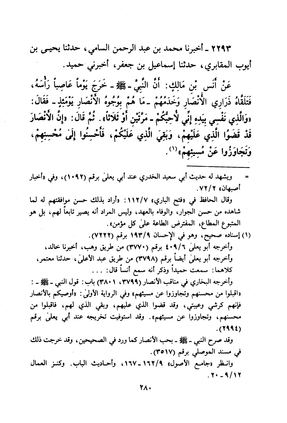 وأخرجه البخاري في مناقب الأنصار (3799، 3801) باب: قول النبي-صلى الله عليه وسلم -: "اقبلوا من محسنهم وتجاوزوا عن مسيئهم" وفي الرواية الأولى: "أوصيكم بالأنصار فإنهم كرشي وعيبتي، وقد قضوا الذي عليهم، وبقي الذي لهم، فاقبلوا من محسنهم، وتجاوزوا عن مسيئهم". وقد استوفيت تخريجه عند أبي يعلى برقم (2994).