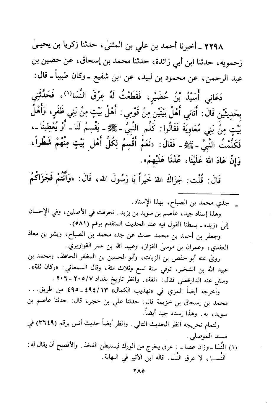 2298 - أخبرنا أحمد بن علي بن المثنى، حدثنا زكريا بن يحيى زحمويه، حدثنا ابن أبي زائدة، حدثنا محمد بن إسحاق، عن حصين بن عبد الرحمن، عن محمود بن لبيد، عن ابن شفيع- وكان طبيباً- قال: