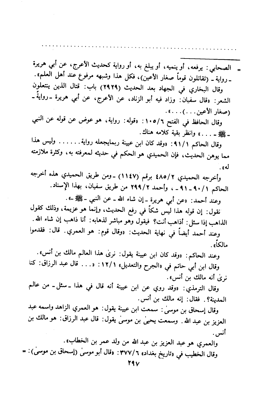 = الصحابي: يرفعه، أو ينميه، أو يبلغ به، أو رواية كحديث الأعرج، عن أبي هريرة - رواية- (تقاتلون قوماً صغار الأعين)، فكل هذا وشبهه مرفوع عند أهل العلم".