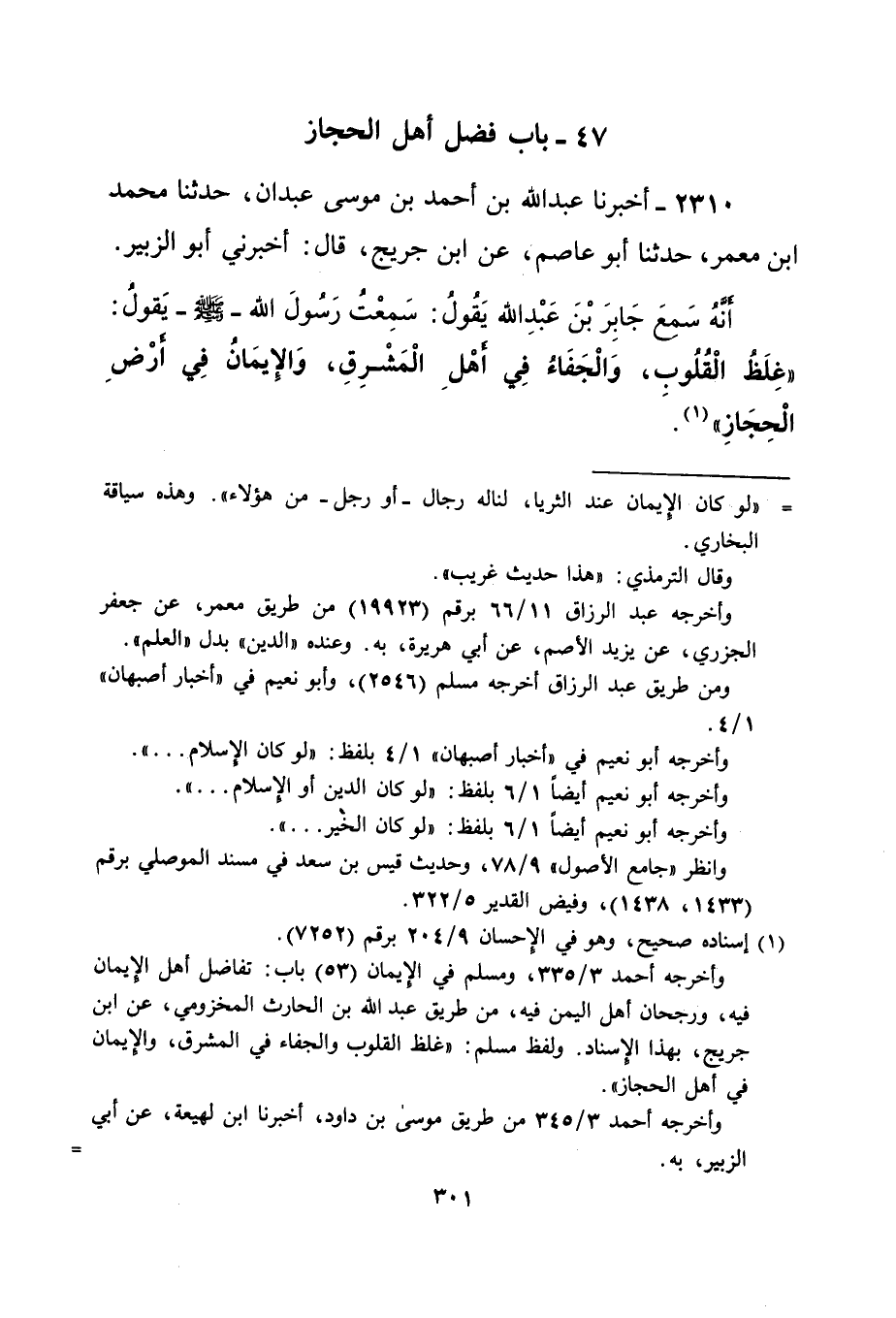 أنه سَمعَ جَابِرَ بْنَ عَبْدِ الله يَقُولُ: سَمِعْتُ رَسُول الله -صلى الله عليه وسلم- يَقولُ: "غلَظُ الْقُلُوبِ، وَالْجَفَاءُ فِي أهْلِ الْمَشْرِقِ، وَالإِيمَانُ فِي أرْضِ الْحِجَازِ" (¬1).