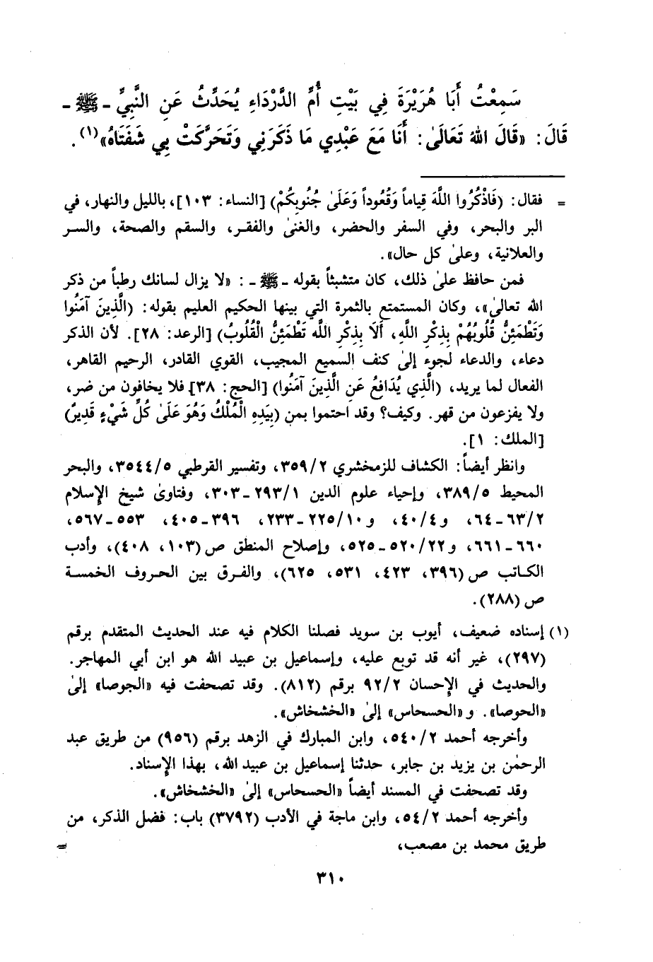 سَمِعْتُ أَبَا هُرَيْرَةَ فِي بَيْتِ أُمِّ الدَّرْدَاءِ يُحَدِّثُ عَنِ النَّبِيِّ -صلى الله عليه وسلم- قَالَ: "قَالَ اللهُ تَعَالَى: أنَا مَعَ عَبْدِي مَا ذَكَرَنِي وَتَحَرَّكَتْ بِي شَفَتاة" (¬1).