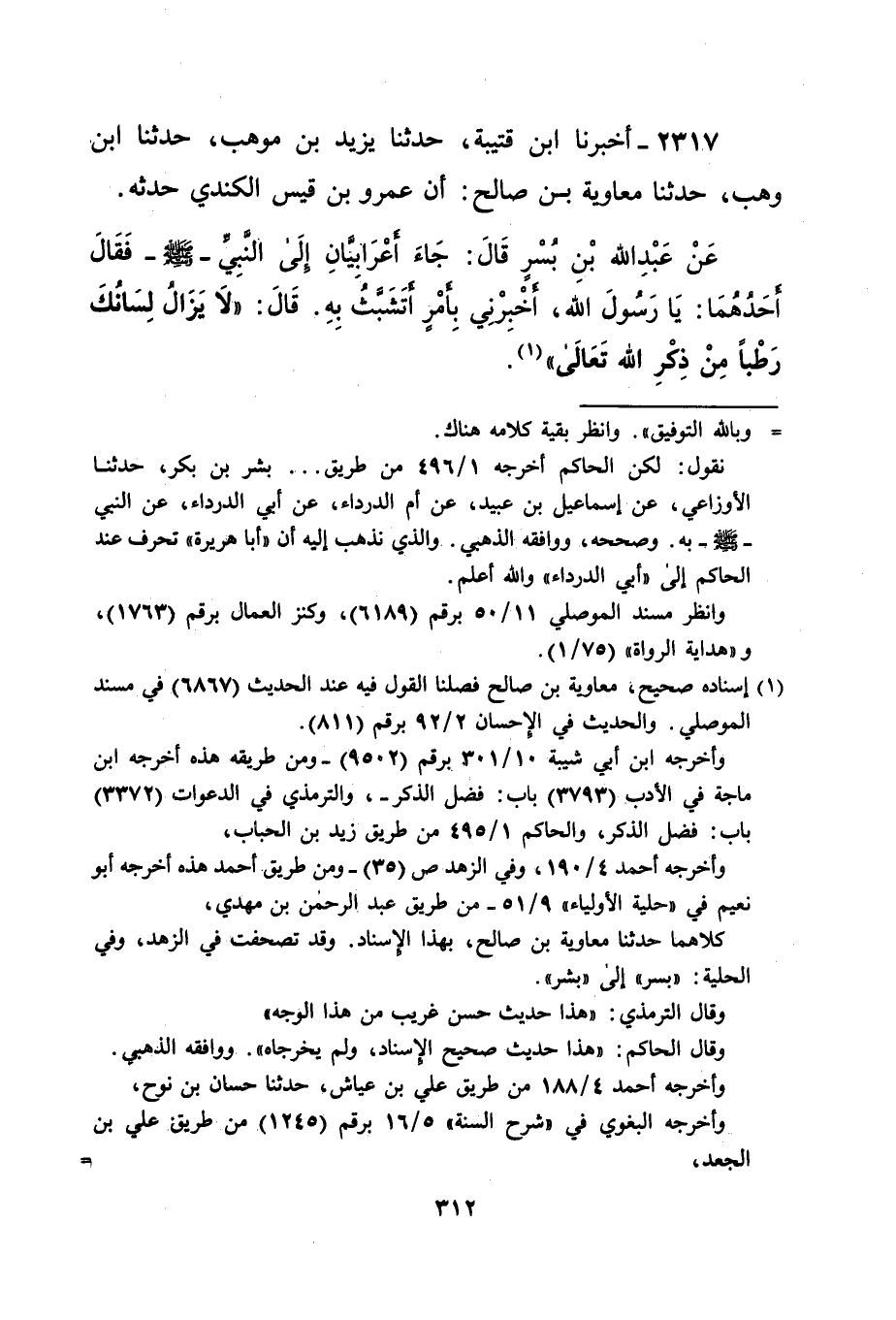 عَنْ عَبْدِ الله بْنِ بُسْرٍ قَالَ: جَاءَ أعرابيان إلَى اْلنبِى -صلى الله عليه وسلم-فَقَالَ أحَدُهُمَا: يَا رَسُول الله، أَخْبِرْنِي بِأَمْرٍ أَتَشَبَّثُ بِهِ. قَالَ: "لا يَزَالُ لِسَانُكَ رَطْباً مِنْ ذِكْرِ الله تَعَالَى" (¬1).