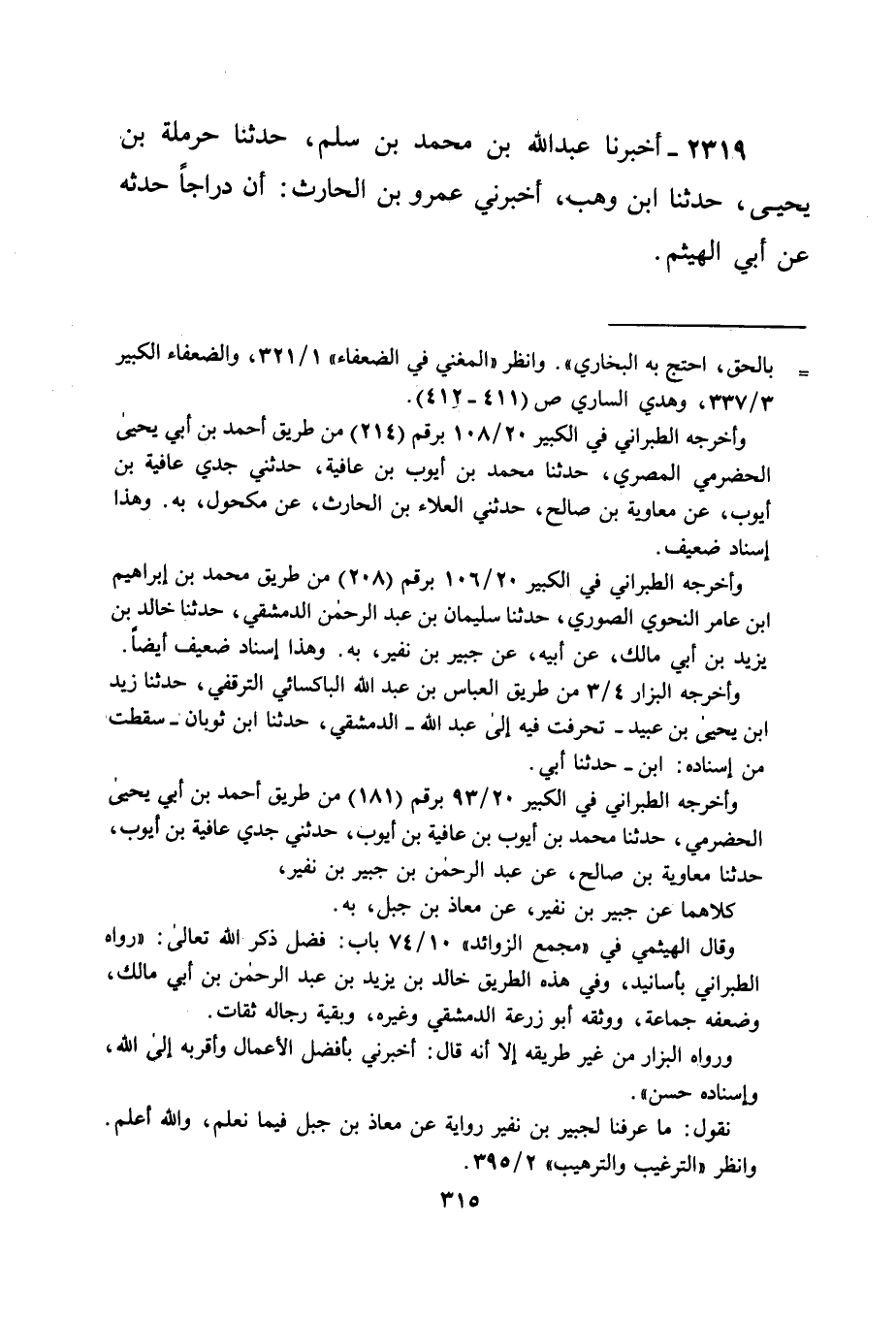 2319 - أخبرنا عبد الله بن محمد بن سلم، حدثنا حرملة بن يحيى، حدثنا ابن وهب، أخبرني عمرو بن الحارث: أن دراجاً حدثه عن أبي الهيثم.