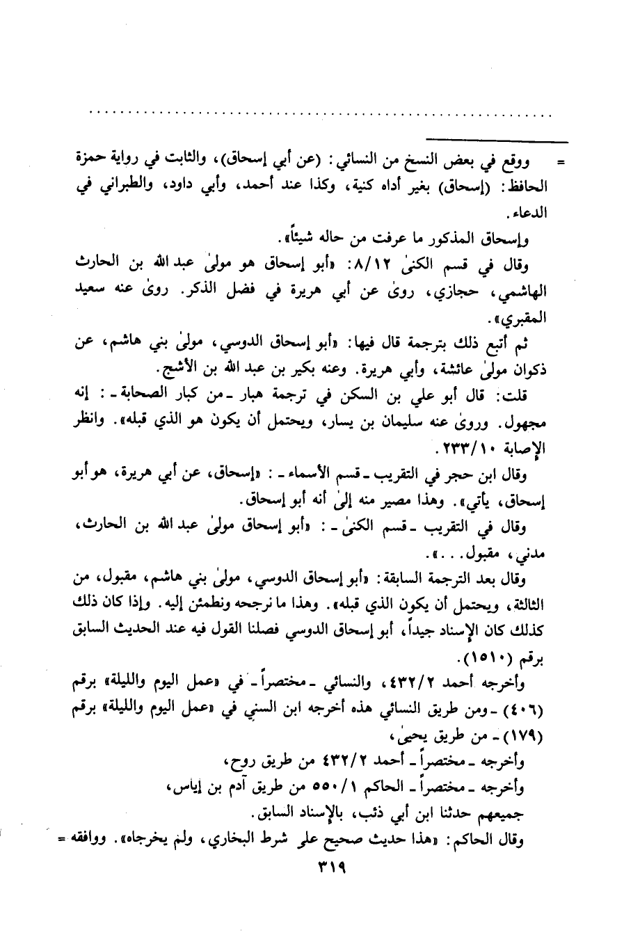 = ووقع في بعض النسخ من النسائي: (عن أبي إسحاق)، والثابت في رواية حمزة الحافظ: (إسحاق) بغير أداه كنية، وكذا عند أحمد، وأبي داود، والطبراني في الدعاء.