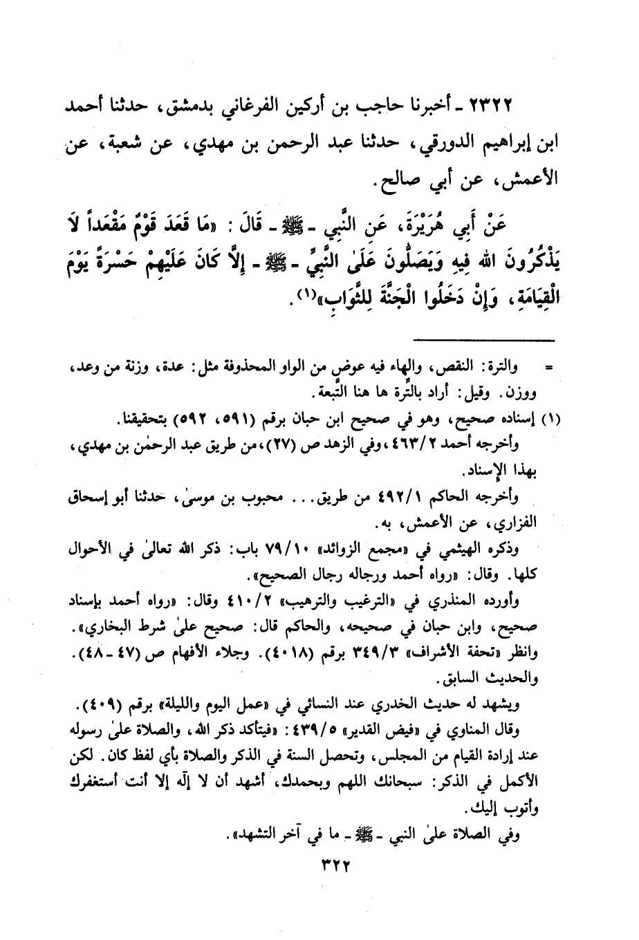 2322 - أخبرنا حاجب بن أركين الفرغاني بدمشق، حدثنا أحمد ابن إبراهيم الدورقي، حدثنا عبد الرحمن بن مهدي، عن شعبة، عن الأعمش، عن أبي صالح.