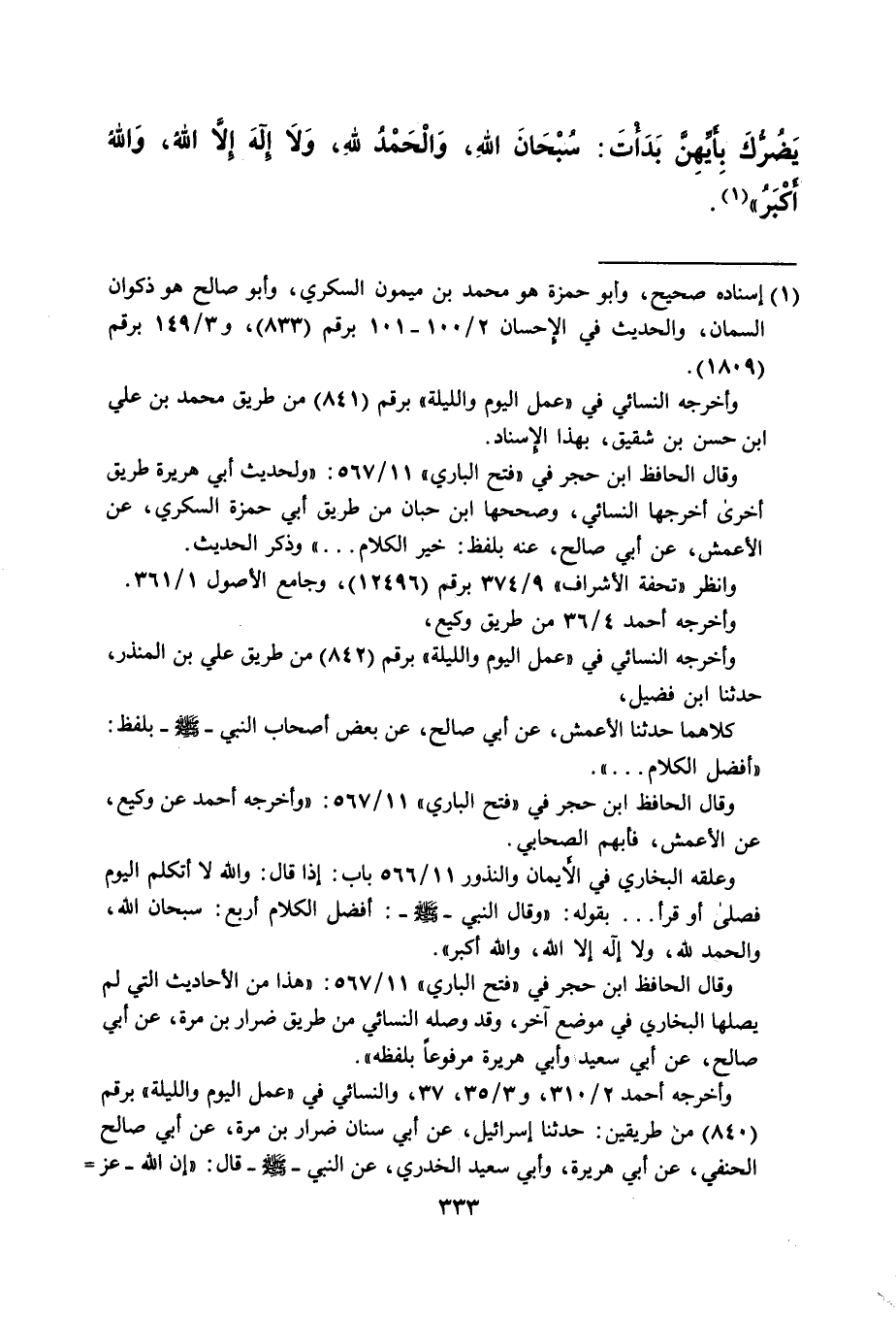 يَضُرُّكَ بِأَيِّهِنَّ بَدَأْتَ: سُبْحَانَ اللهِ، وَالْحَمْد للهِ، وَلا إله إلا الله، وَالله أكْبَر" (¬1).