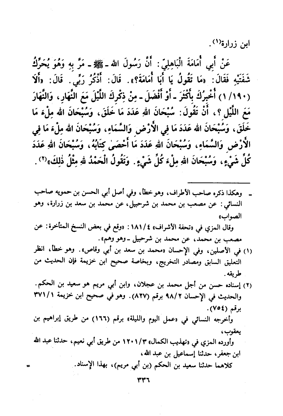 عَنْ أَبِي أُمامَةَ الْبَاهِلِيّ: أَنَّ رَسُول الله -صلى الله عليه وسلم- مَرَّ بِهِ وَهُوَ يُحَرك شَفَتَيْهِ فَقَالَ: "مَا تَقُولُ يَا أبَا أمَامَةَ؟ ". قَالَ: أَذْكُرُ رَبِّي. قَالَ: "ألا (190/ 1) أُخْبِرُكَ بِأَكْثَرَ- أوْ أفْضَلَ- مِنْ ذِكْرِكَ الليْلَ مَعَ النهَارِ، وَالنَّهَارَ مَعَ اللَّيْلِ؟، أَنْ تَقُولَ: سُبْحَانَ الله عَدَدَ مَا خَلَقَ، وَسُبْحَانَ الله مِلْءَ مَا خَلَقَ، وسُبْحانَ الله عَدَدَ مَا فِي الأرْضِ والسَّماءِ، وَسُبْحَانَ الله مِلْءَ مَا فِي الأرْضِ وَالسَّمَاءِ، وسبحان اللهِ عَدَدَ مَا أحْصَى كِتَابُة، وَسُبْحَانَ اللهِ عَدَدَ كُلِّ شَيْءٍ، وَسُبْحَانَ اللهِ مِلْءَكلِّ شَيْءٍ. وَتَقُولُ الْحَمْد للهِ مِثْلُ ذلِكَ" (¬2).