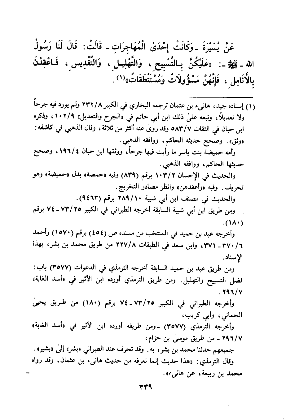 عَنْ يُسَيْرَةَ- وَكَانَتْ إحْدَى الْمُهَاجِرَاتِ- قَالَتْ: قَالَ لَنَا رَسُول الله -صلى الله عليه وسلم-: "عَلَيْكُنَّ بِالتَّسْبِيحِ، وَالتَّهْلِيلِ، وَالتَّقْدِيسِ، فَاعْقِدْنَ بالأنَامِلِ، فَإِنَّهُنَّ مَسْؤولاتٌ وَمُسْتَنْطَقَاتٌ" (¬1).