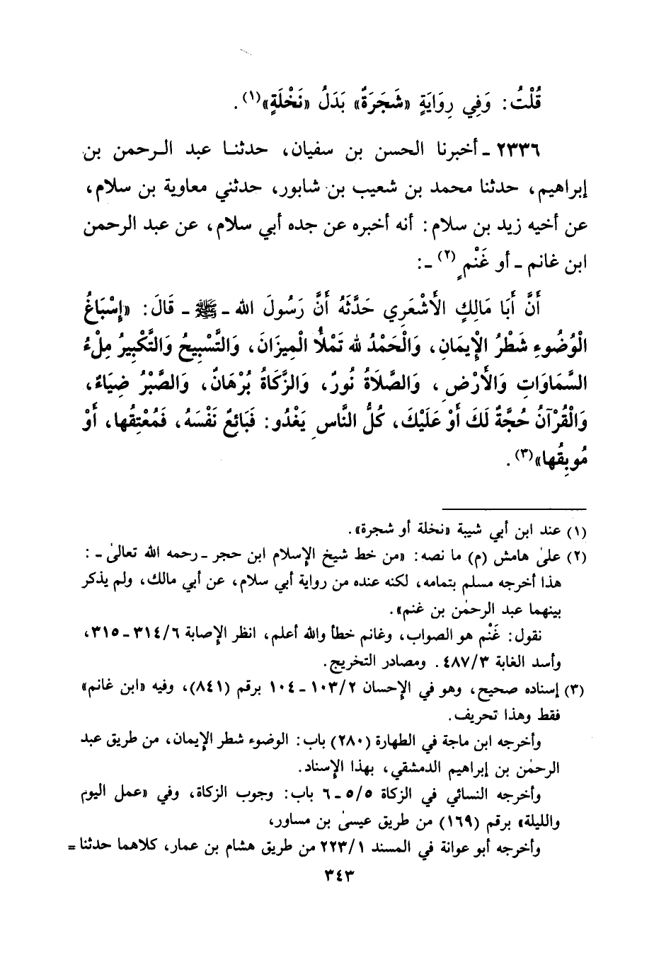 2336 - أخبرنا الحسن بن سفيان، حدثنا عبد الرحمن بن إبراهيم، حدثنا محمد بن شعيب بن شابور، حدثني معاوية بن سلام، عن أخيه زيد بن سلام: أنه أخبره عن جده أبي سلام، عن عبد الرحمن ابن غانم- أو غَنْمٍ (¬2) -: