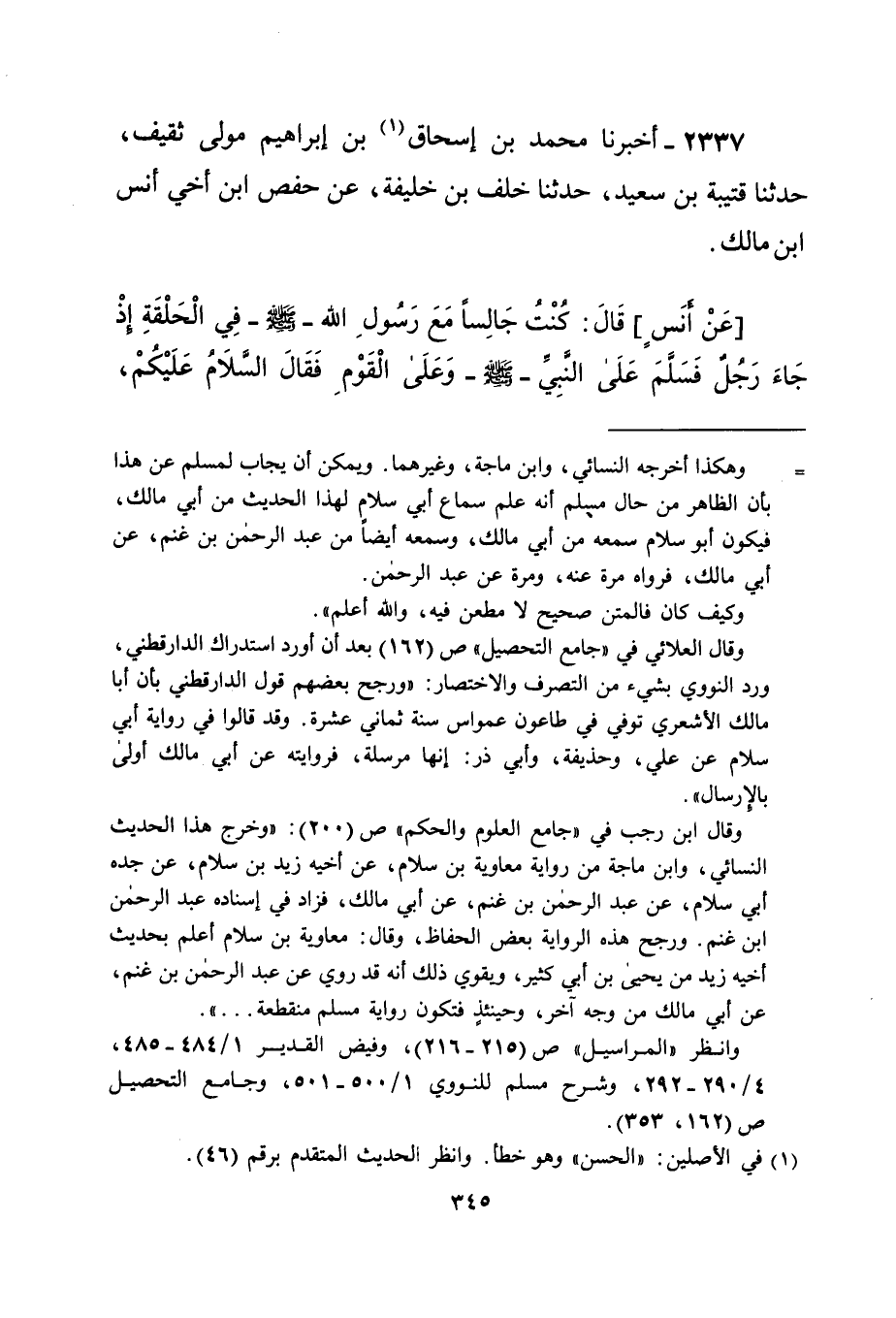 [عَنْ أنَسٍ] قَالَ: كُنْتُ جَالِساً مَعَ رَسُولِ الله -صلى الله عليه وسلم- فِي الْحَلْقَةِ إذْ جَاءَ رَجلٌ فَسَلَّمَ عَلَى النَّبِيّ -صلى الله عليه وسلم- وَعَلَى الْقَوْمِ فَقَالَ السَّلاَمُ عَلَيْكُمْ،