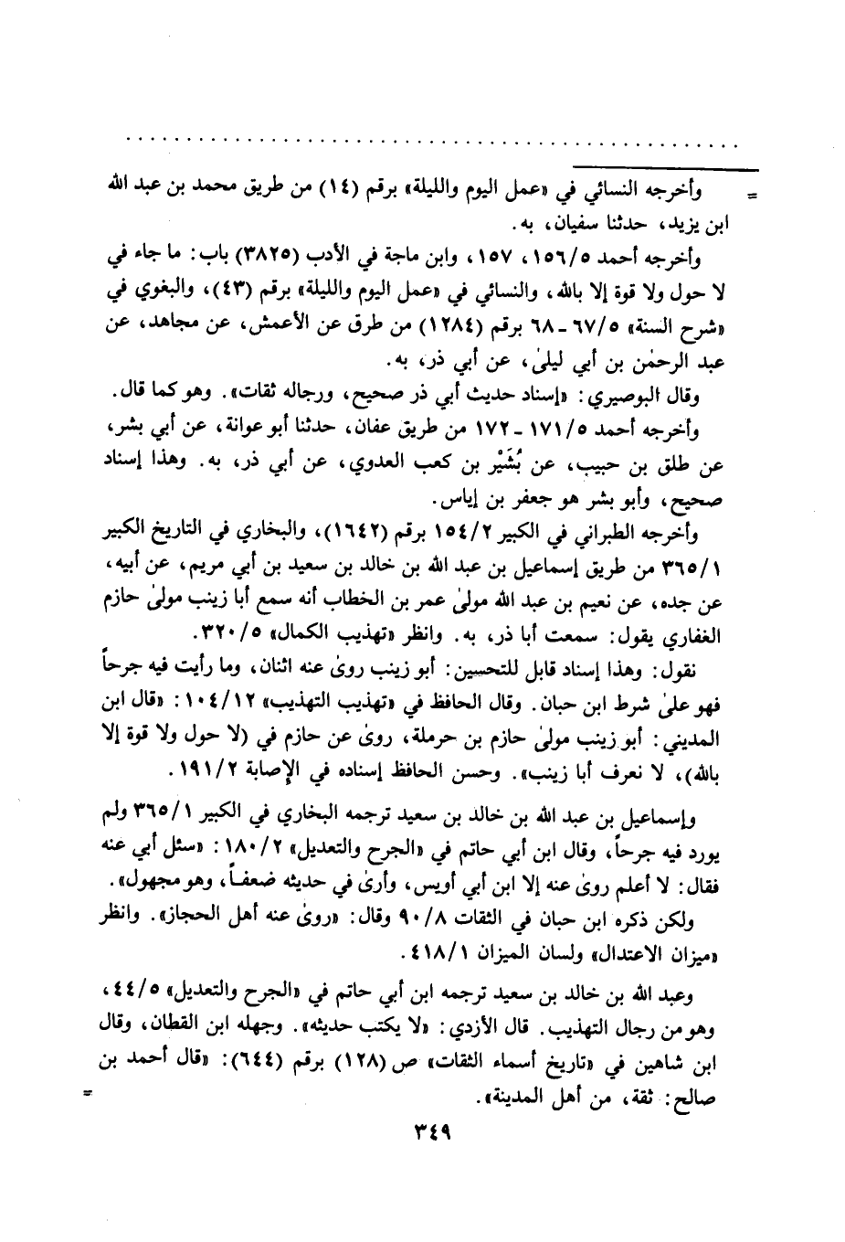وعبد الله بن خالد بن سعيد ترجمه ابن أبي حاتم في"الجرح والتعديل" 5/ 44، وهو من رجال التهذيب. قال الأزدي: "لا يكتب حديثه". وجهله ابن القطان، وقال ابن شاهين في "تاريخ أسماء الثقات" ص (128) برقم (644): "قال أحمد بن صالح: ثقة، من أهل المدينة". =