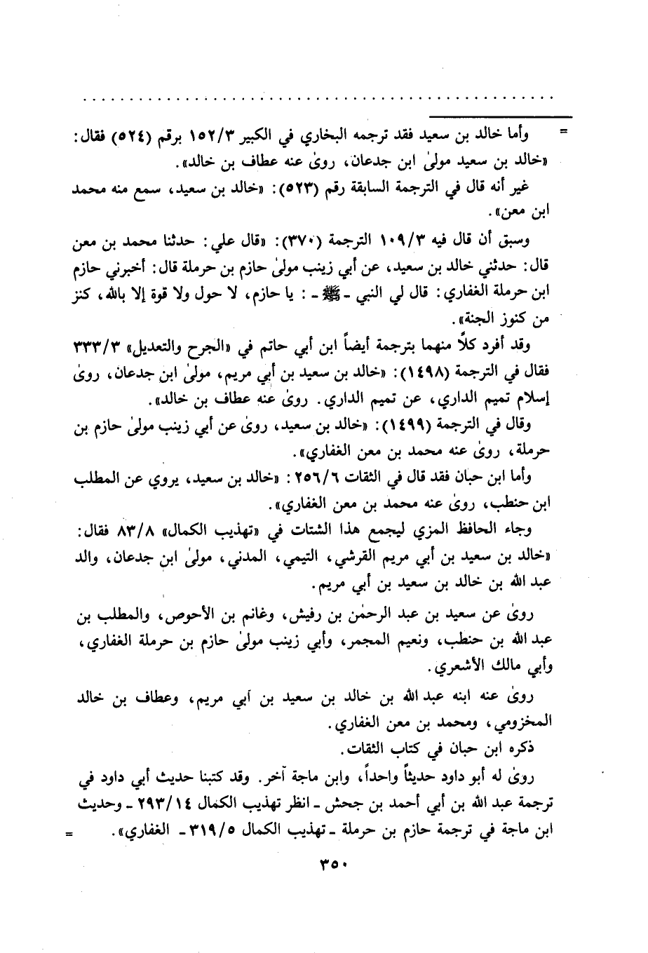 وقد أفرد كلاً منهما بترجمة أيضاً ابن أبي حاتم في "الجرح والتعديل" 3/ 333 فقال في الترجمة (1498): "خالد بن سعيد بن أبي مريم، مولى ابن جدعان، روى إسلام تميم الداري، عن نميم الداري. روى عنه عطاف بن خالد".