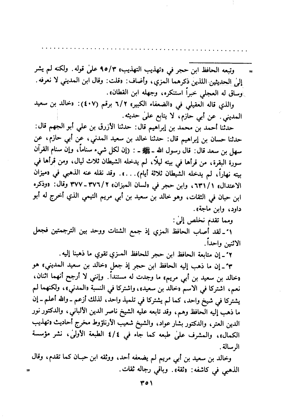 ً3 - إن ما ذهب إليه الحافظ ابن حجر إذ جعلٍ "خالد بن سعيد المديني" هو "خالد بن سعيد بن أبي مريم" ما وجدت له مستنداً. وإنني لا أرجح أنهما اثنان، نعم، اشتركا في الاسم "خالد بن سعيد"، واشتركا في النسبة "المدني"، ولكنهما لم يشتركا في شيخ واحد، كما لم يشتركا في تلميذ واحد، لذلك أزعم- والله أعلم- إن ما ذهب إليه الحافظ وهم، وقد تابعه عليه الشيخ ناصر الدين الألباني، والدكتور نور الدين العتر، والدكتور بشار عواد، والشيخ شعيب الأرناؤوط مخرج أحاديث "تهذيب الكمال"، والمشرف على طبعه كما جاء في 4/ 4 الطبعة الأولى، نشر مؤسسة الرسالة.