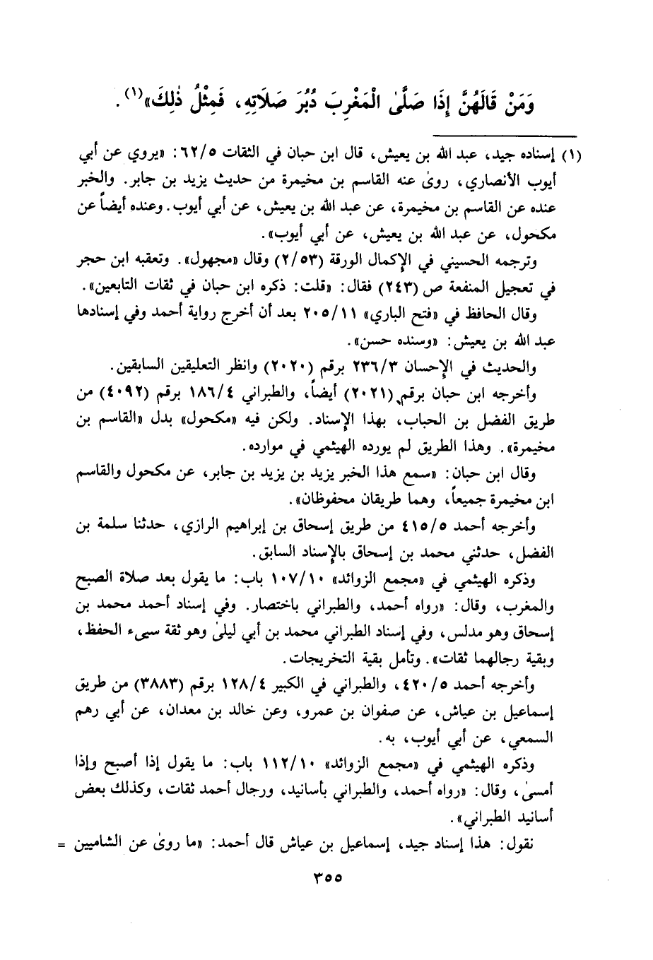 وذكره الهيثمي في "مجمع الزوائد" 10/ 157 باب: ما يقول بعد صلاة الصبح والمغرب، وقال: "رواه أحمد، والطبراني باختصار. وفي إسناد أحمد محمد بن إسحاق وهو مدلس، وفي إسناد الطبراني محمد بن أبي ليلى وهو ثقة سيىء الحفظ، وبقية رجالهما ثقات". وتأمل بقية التخريجات.