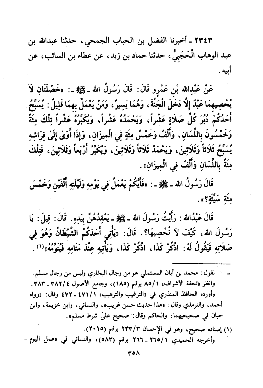 عَنْ عَبْدِ الله بْنِ عمرو قَالَ: قَالَ رَسُولُ الله -صلى الله عليه وسلم-: "خَصْلَتَانِ لا يُحْصِيهِمَا عبدٌ إلا دَخَلَ الْجَنَّةَ، وَهُمَا يسيرٌ، وَمَنْ يَعْمَلُ بِهِمَا قَلِيلٌ: يسبحُ أحَدُكمْ دُبُرَ كُلّ صَلاَةٍ عَشْراً، وَيَحْمَدُهُ عَشْراً، وَيُكَبِّرُهُ عشراً تِلْكَ مِئَةٌ وَخَمْسُونَ باللِّسانِ، وَألْفٌ وَخَمْسُ مِئَةٍ فِي الْمِيزَانِ، وَإذَا أَوَى إلَى فِرَاشِهِ يُسبِّحُ ثَلاثاً وَثَلاِثينَ، ويحمد ثَلاَثاً وَثَلاثِينَ، ويكبر أرْبَعاً وَثلاثين، فَتِلْكَ مِئَةٌ بِاللِّسَانِ ؤَأَلْفٌ فِي الْمِيزَانِ". قَالَ رَسُولُ الله -صلى الله عليه وسلم-: "فَأيُّكُمْ يَعْمَلُ فِي يَوْمِهِ وَلَيْلَتِهِ ألْفَيْنِ وَخَمْسَ مِئَةِ سيئةٍ؟ ".
