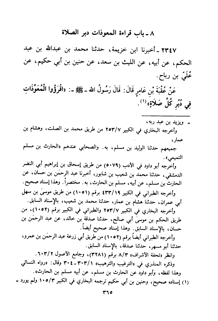 عَنْ عُقْبَةَ بْنِ عَامِرٍ قَالَ: قَالَ رَسُولُ الله -صلى الله عليه وسلم-: "اقْرَؤُوا الْمُعَوِّذَاتِ فِي دُبُرِ كُلِّ صَلاَةٍ" (¬1).