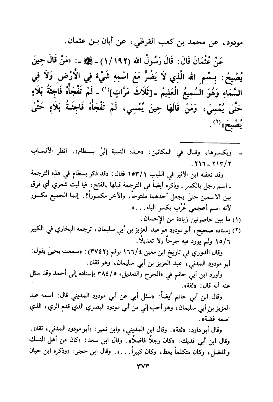 عَنْ عُثْمَانَ قَالَ: قَالَ رَسُولُ الله (192/ 1) -صلى الله عليه وسلم-: "مَنْ قَالَ حِينَ يُصْبِحُ: بِسْمِ الله الَّذِي لا يَضُرُّ مَعَ اسْمِهِ شَيْءٌ فِي الأرْضِ وَلا فِي السَّمَاءِ وَهُوَ السميع الْعَلِيمُ-[ثَلاثَ مرات] (¬1) - لَمْ تَفْجَأْهُ فَاجِئَةُ بَلاءٍ حَتَّى يُمْسِيَ، وَمَنْ قَالَهَا حِينَ يُمْسِي، لَمْ تَفْجَأْهُ فَاجِئَةُ بَلاءٍ حَتَّى يُصْبِحَ" (¬2).