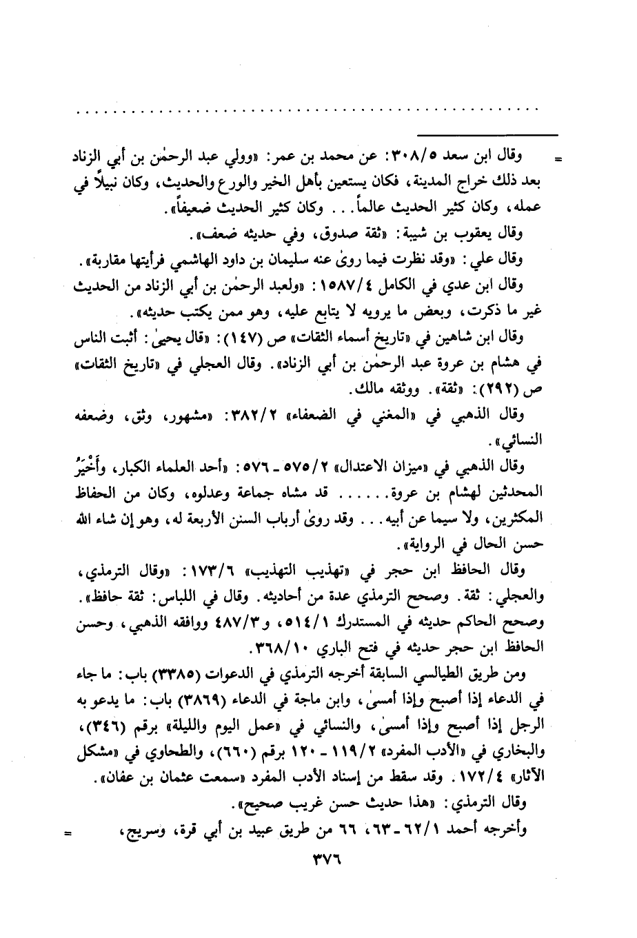 = وقال ابن سعد 5/ 308: عن محمد بن عمر: "وولي عبد الرحمن بن أبي الزناد بعد ذلك خراج المدينة، فكان يستعين بأهل الخير والورع والحديث، وكان نبيلاً في عمله، وكان كثير الحديث عالماً ... وكان كثير الحديث ضعيفاً".