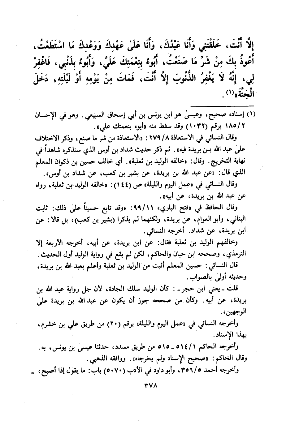 وقال النسائي في الاستعاذة 8/ 279: "الاستعاذة من شر ما صنع، وذكر الاختلاف على عبد الله بن بريدة فيه". ثم ذكر حديث شداد بن أوس الذي سنذكره شاهداً في نهاية التخريج. وقال: "خالفه الوليد بن ثعلبة". أي خالف حسين بن ذكوان المعلم الذي قال: "عن عبد الله بن بريدة، عن بشير بن كعب، عن شداد بن أوس".