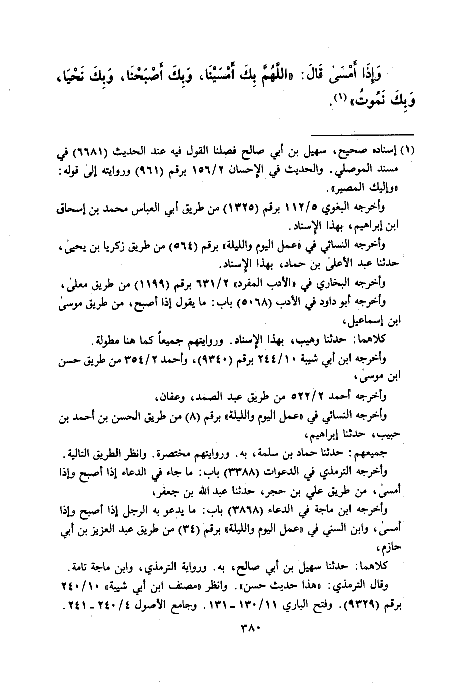 وأخرجه الترمذي في الدعوات (3388) باب: ما جاء في الدعاء إذا أصبح وإذا أمسى، من طريق علي بن حجر، حدثنا عبد الله بن جعفر، وأخرجه ابن ماجه في الدعاء (3868) باب: ما يدعو به الرجل إذا أصبح وإذا أمسى، وابن السني في "عمل اليوم والليلة" برقم (34) من طريق عبد العزيز بن أبي حازم، كلاهما: حدثنا سهيل بن أبي صالح، به. ورواية الترمذي، وابن ماجه تامة.